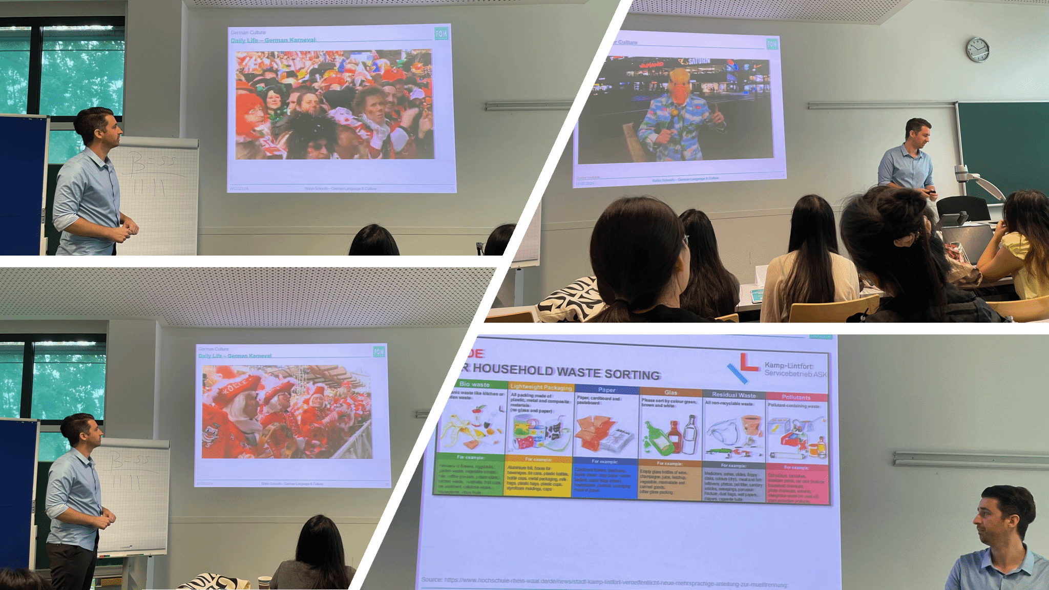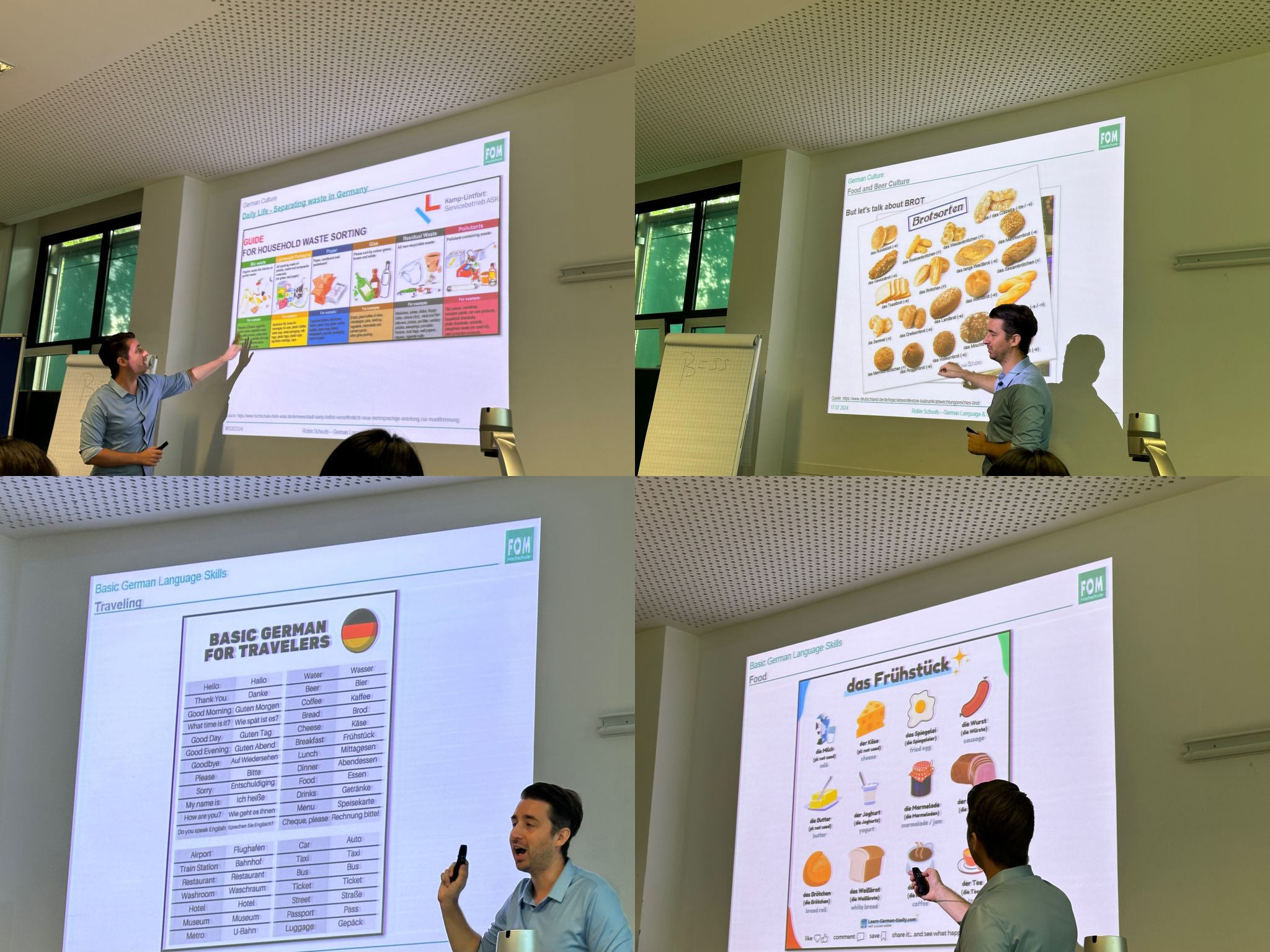 上午,我们投身于德国文化的学习之旅中。首先,我们深入钻研了德国的日常生活用语,从简洁的“Guten Tag”(你好)到复杂的日常交流用语,每一个词汇、每一个句子都在老师生动有趣地讲解下变得鲜活生动。通过反复地练习与模仿,我们仿佛已经置身于德国的街头巷尾,与当地人亲切交流,畅谈人生。