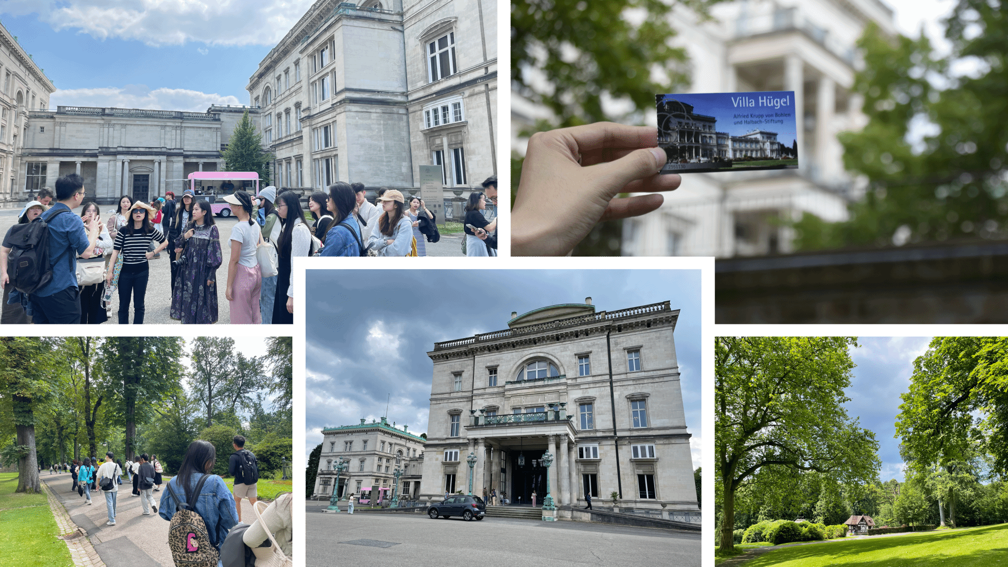 下午,我们踏入了19世纪实业家的庄园——Villa Hugel。公元 1873 年,大名鼎鼎的加农炮之王,已是当时欧洲首富的阿尔弗雷德·克虏伯(Alfred Krupp)的新家建成,他将其命名为 Villa Hugel。这座庄园位于德国北威州埃森市南郊,高踞鲁尔河北岸,建于山丘的一大片平地上。围绕房舍有里外两圈绿地,里圈是属于克虏伯的私家花园,外圈则是被叫做“克虏伯森林”的私家森林。这座宏伟壮观的庄园散发着浓厚的历史气息,其典雅庄重的建筑风格、精致优美的园林景观都让我们叹为观止。漫步其中,我们仿佛穿越时空,回到了那个辉煌的时代,感受着实业家们的智慧与辛勤。庄园中的每一间房间、每一件摆设都仿佛在诉说着过去的故事,让我们对德国的历史和文化有了更加直观、深刻地理解。
