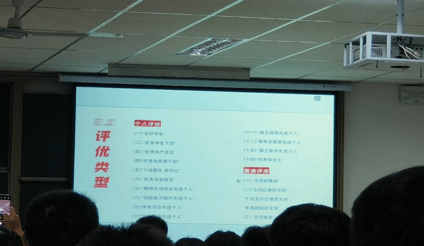 辅导员为同学们介绍了评奖评优的具体内容以及学校相关规章制度。评奖评优是为挖掘、表彰学生中的先进典型,重点讲解了奖学金的综测分管理方法以及计算公式,学校注重学生的学习成绩发展的智育分达到了百分之七十,剩下的百分之三十由完满教育活动分数组成,但其中由上课考勤、寝室晚归未扣分制度等构成了公式中的减分项,侧面出反映出学校希望同学们养成不晚归、不逃课、合理请假的遵守规章制度行为习惯。为激励学生勤奋学习,潜心科研,勇于创新,积极进取,学校特建立各项奖励机制,如“移通优秀学生奖学金”来鼓励同学们勤奋学习、努力进取,专心向学,在德、智、体、美、劳等方面得到全面发展。它是褒奖,亦是鞭策。助学筑梦助人,望同学们学以致用,不负使命,砥砺前行!