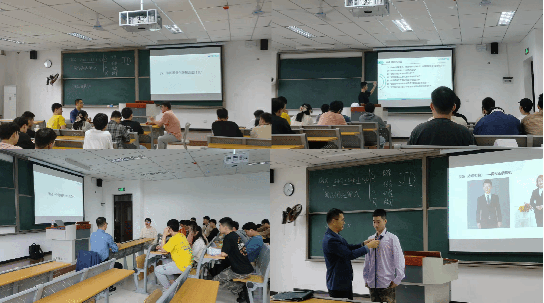 张老师通过分组及破冰活动帮助同学们更深入的交流和认识。随后,张老师通过企业要什么、我们应该准备什么、话术怎么讲三个问题为同学们讲解了给面试技巧。张老师还现场进行了面试演练:黄金10问。同学们积极主动尝试,张老师也给出了专业的完善建议,比如善用“STAR”“三段式”“内观自己、外察行情”等等相关面试技巧。张老师也现场组织了一场无领导小组讨论,让同学们直观面试模拟。最后,张老师告诉同学们面试时一定要注意着装,面试中得体的着装搭配整洁的仪容仪表传递给面试官“十分重视面试”的态度,张老师还给同学们讲解了座次礼仪等相关职场礼仪。