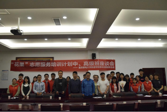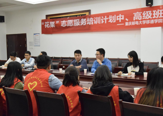 2018年4月17日晚上七点在我校行政楼107会议室,举行了重庆邮电大学移通学院“花果”培训计划中级班第二期第四讲暨高校志愿服务工作座谈会。我校有幸邀请到中国青年志愿者协会副秘书长张俊虎教授为同学们讲述志愿服务与大学生成长,并与在场的各院系志愿服务版块指导老师、志愿骨干们进行深入交流。