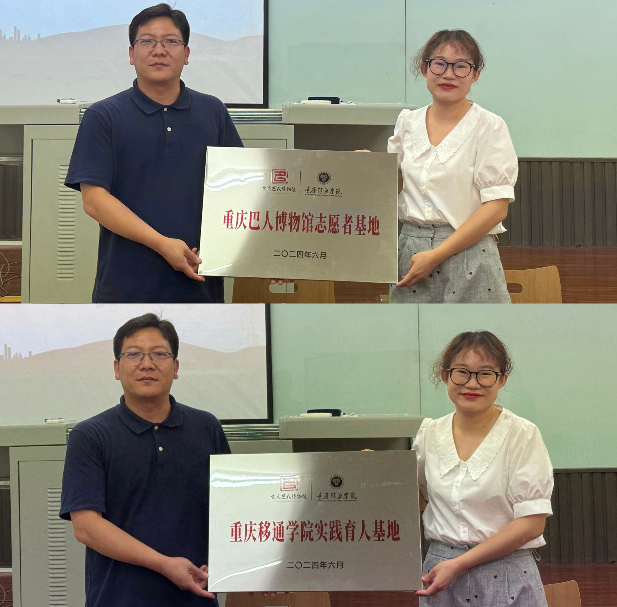 紧接着进行了授牌仪式,重庆移通学院代表王永刚副校长和重庆巴人博物馆副馆长兼书记鲁洲燕进行握手后,鲁洲燕书记为重庆移通学院钓鱼城历史文化博物馆授予了“重庆巴人博物馆志愿者基地”的牌匾,这标志着钓鱼城历史文化博物馆在巴渝文化传承的道路上迈出了更加坚实自信的步伐。这一牌匾的授予不仅仅是重庆巴人博物馆对我馆的信任,同时也象征着馆校双方在未来进行更紧密的工作交流和教育合作,共同推动文化教育事业的发展。