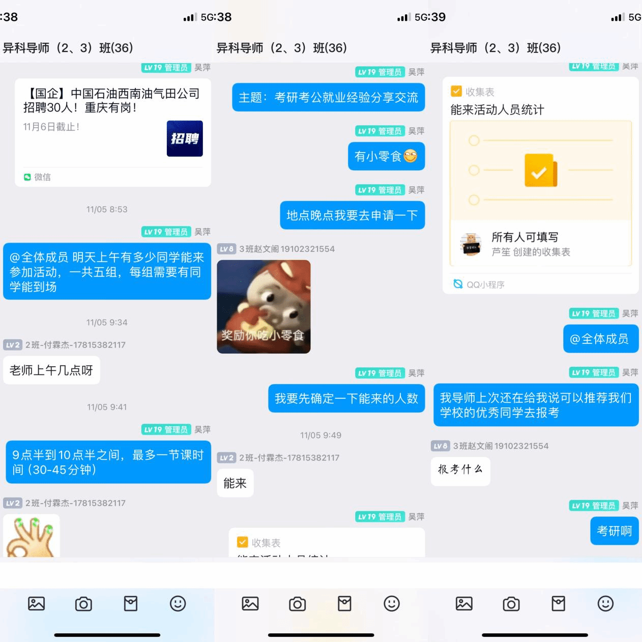 异科导师吴萍围绕“就业、考研、考公经验分享线上线下活动”,随着11月的到来,学生们也陆续考完试,离开学校去寻找更多就业机会,异科导师吴萍精心策划了一场线上线下的“就业、考研、考公经验分享交流活动”,本次活动分为线上线下两个部分,在线上环节中,主要针对离校的同学通过在线平台(QQ)实时发送各类招聘信息,并为他们解答就业、考研、考公方面的问题,而线下活动在南湖书院103室(异科导师谈心谈话场所)开展,通过面对面的方式给他们讲述我在“就业、考研、考公”过程中的经验,同时还为到场同学准备了小零食,让他们能够在一个舒缓的环境中敞开交流。此次活动目的在于让同学们从他人的经历中吸取经验,并化为自身前进的动力,为自己的未来找到一条合适自己的道路。