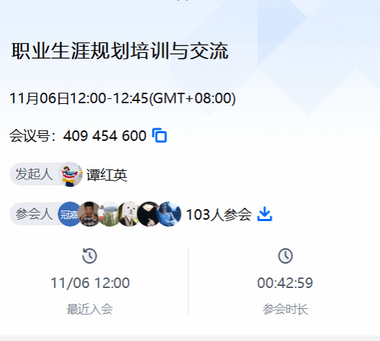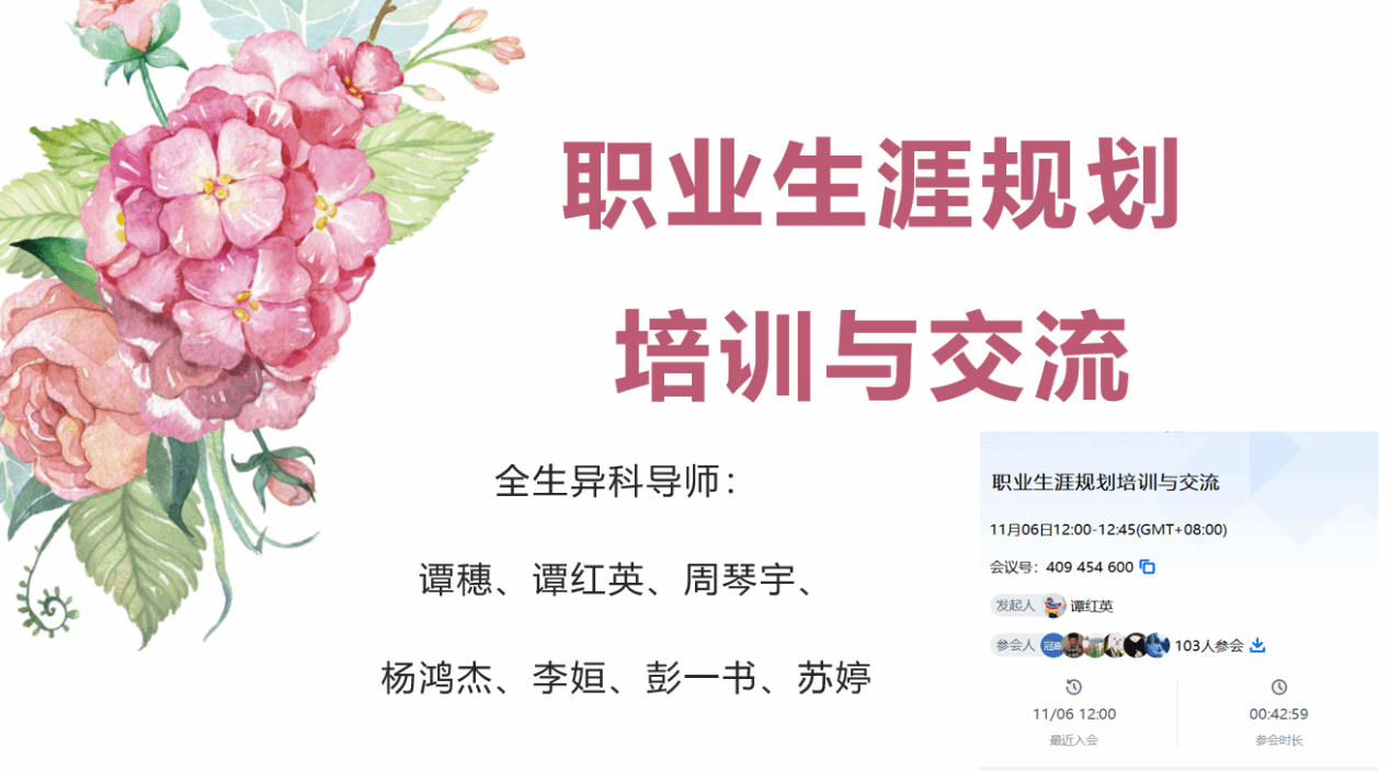 为了促进异科学生对自我认知、职业探索和职业规划能力的提升,同时增强学生对职业生涯规划重要性的认识。11月6日上午12:00,异科导师谭穗、谭红英、周琴宇、杨鸿杰、李姮、彭一书、苏婷联合其异科学生共100多位同学于腾讯会议开展了“职业生涯规划培训与交流“的线上会议,本次会议旨在引导学生提前做好职业生涯的规划以及鼓励学生参加第二届全国大学生职业规划大赛。本次职业生涯规划培训与交流会议的开展,不仅为异科学生们提供了宝贵的经验和指导,还激发了他们规划职业生涯的热情和信心。相信在老师们的精心培养和引导下,学生们一定能够在未来的学习和生活中取得更加优异的成果。
