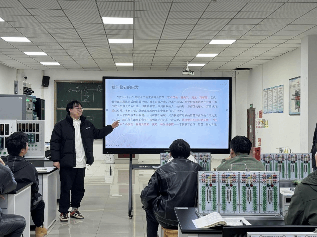 刘洋老师分享了《段永平传——敢为天下后》这本书,由于2024级轨道交通电气与控制(专升本)2班都是大三的学生,刚刚进入大学本科校园,在对未来的发展方向正在感到迷惘,刘老师想要通过段永平和他创业的故事告诉班级所有的学生:无论在哪个领域,只要我们有足够的智慧和勇气去“敢为天下后”,就总能在激烈的竞争中找到属于自己的一片天地。他用他的实际行动证明了“敢为天下后”不仅是一种商业策略,更是一种生活态度——它代表着勇气、智慧、耐心和远见。