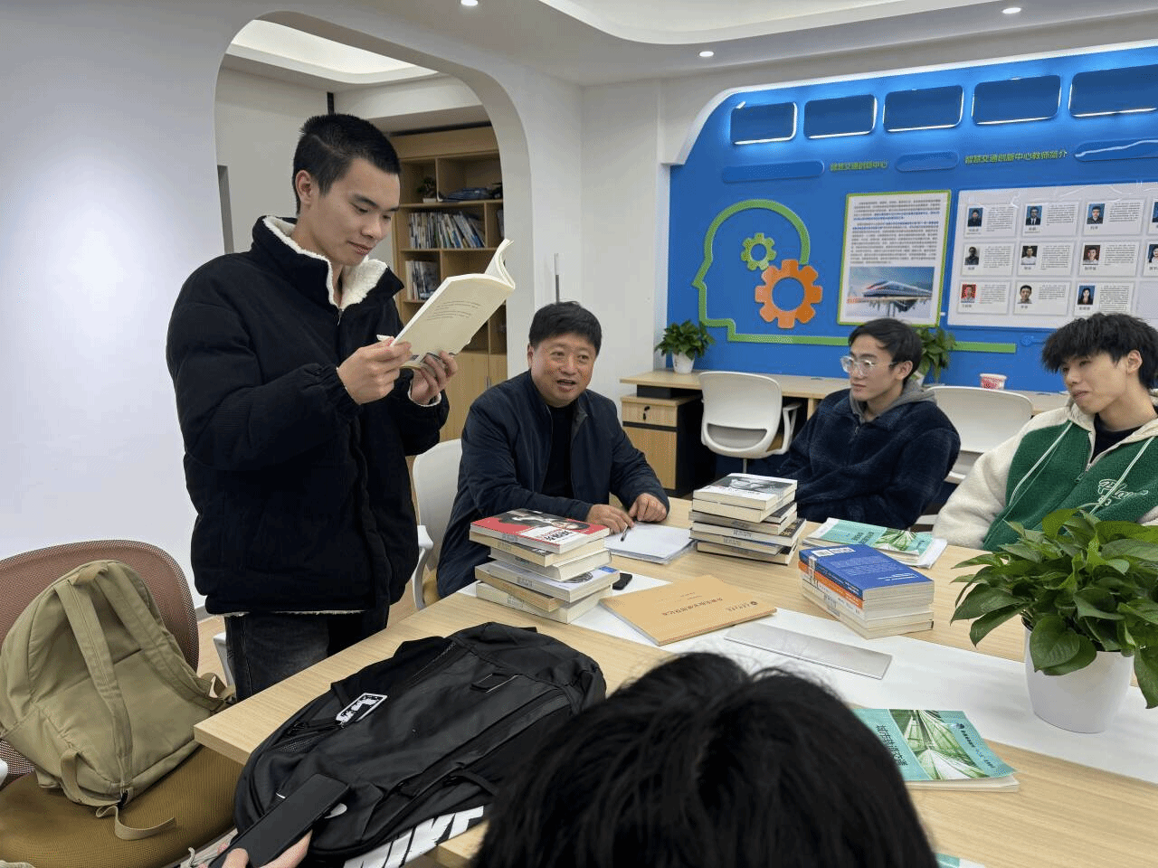 12月5日,智能交通教研室冯铁成老师在松格A05智能交通创新工坊,组织2024级轨道交通信号与控制专升本贯通1班的学生,开展了大咖阅读分享活动。