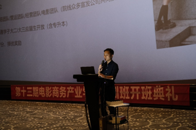 随后,电影商务产业学院杨磊副院长宣布第十三期电影商务产业学院实训班正式启动,详细地介绍了往届实训班的实践成果、本届实训班的培养目标以及课程安排设置,并且对同学们关心的问题做出了细致的解答。此次实训班可谓大咖云集,合作单位的介绍更是引起了在座同学们的阵阵惊叹。