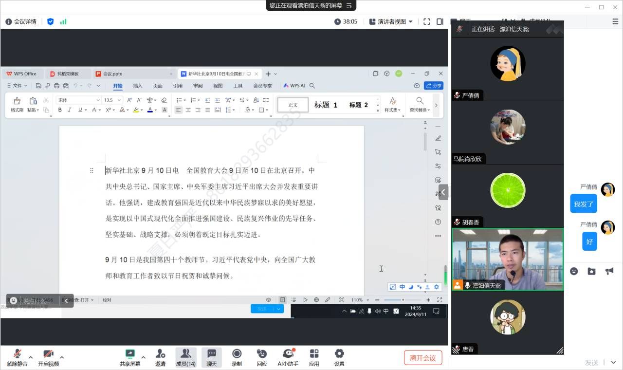 本次会议首先由杨勇老师带领大家学习了9月9日至10日在北京召开的全国教育大会精神,习近平总书记指出要“实施教育家精神铸魂强师行动,加强师德师风建设”,这为我们指明了方向。随后,与会教师认真学习了《中共中央国务院关于弘扬教育家精神加强新时代高素质专业化教师队伍建设的意见》,特别是其中“涵养高尚师德师风”部分的内容。老师们就文件中提出的“坚持师德师风第一标准”、“引导教师自律自强”、“加强师德师风培养”和“坚持师德违规'零容忍'”等要求进行了深入的学习和讨论。杨勇老师指出,作为思想道德与法治教研室的教师,我们更应该以身作则,在师德师风建设上走在前列。他强调,要将师德师风建设作为教师队伍建设的首要任务,把握好教书育人的职业操守,树立崇高的职业理想。