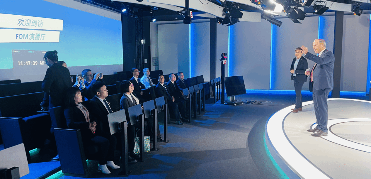 白潇乐校长向代表团成员们详细介绍了FOM斥巨资建设的演播厅,演播厅配备了高端的摄像机、录音设备、后期制作设备和播出设备,可以满足各种形式的教学需求,是该校最新的教学设施之一,也是最先进的教学工具之一。演播厅教学案例的展示,完美解读了现代情景式教学的优势,这一先进工具的投入使用为德中双方学校之间的合作增加了新的助力,共同进行研讨、会晤等。