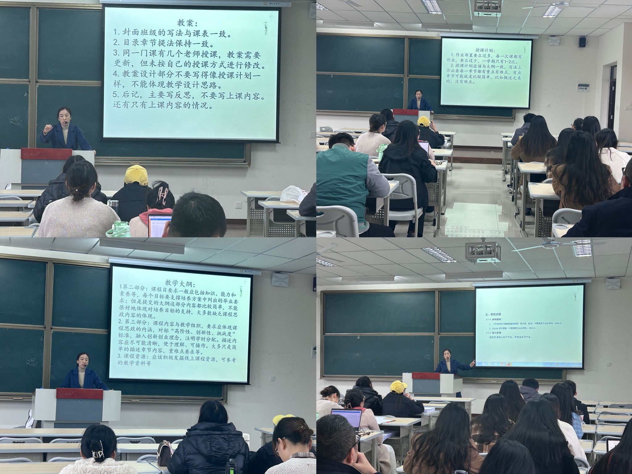 周梦娇老师简单介绍了此次教学资料规范培训的目的,根据学校《关于开展教学资料自查暨优秀教学大纲、教案评选工作的通知》要求,学院于11月9日布置了相关教学资料自查和规范的任务,各教研室立即开展了教学资料自查和互查工作,首先梳理自查发现的问题,同时对照评选的优选教学大纲和教案,对学院全体教师教学资料提出整改要求。
