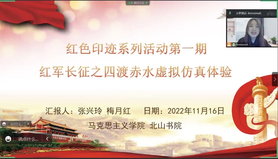为追寻革命先辈足迹,感悟革命精神,传承红色基因,明确新时代青年的责任与担当,11月16日下午3点,马克思主义学院思想道德与法治教研室联合北山书院共同举办“红色印迹”系列活动第一期——“红军长征之四渡赤水虚拟仿真体验”活动。活动由马克思主义学院思想道德与法治教研室张兴玲、梅月红老师主持,北山书院学生代表约100人在线参加。