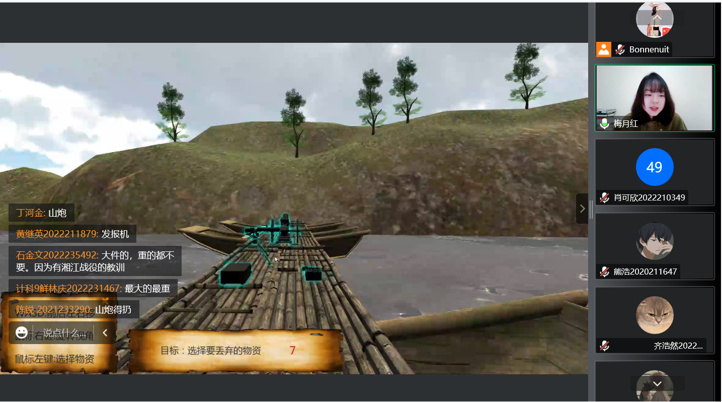 接着,梅月红老师指导来自2022级计算机科学与技术专业的龙海、鲜林庆两位同学,从一渡赤水——摆脱被动、二渡赤水——遵义大捷、三渡赤水——引敌西进、四渡赤水——跳出重围四个方面,向在线100余名师生演示了“四渡赤水”之战的整个过程。同学们在计算机生成的虚拟仿真体验环境中,通过插入交互任务,体验并参与战争,如实施渡江作战战术、碉堡政策应对、智斗敌军、攻打娄山关、选阵地、利用高射机枪打击飞机等,从而深入了解整个历史事件,全方位体验和深刻领会红军四渡赤水跳出国民党军围追堵截的英勇智慧和真实历史,深刻感受到党领导红军战士英勇鏖战、不畏艰险、不怕牺牲、敢于战胜一切困难的集体英雄主义,沉浸式领悟一代伟人毛泽东同志用兵如神的战略战术。