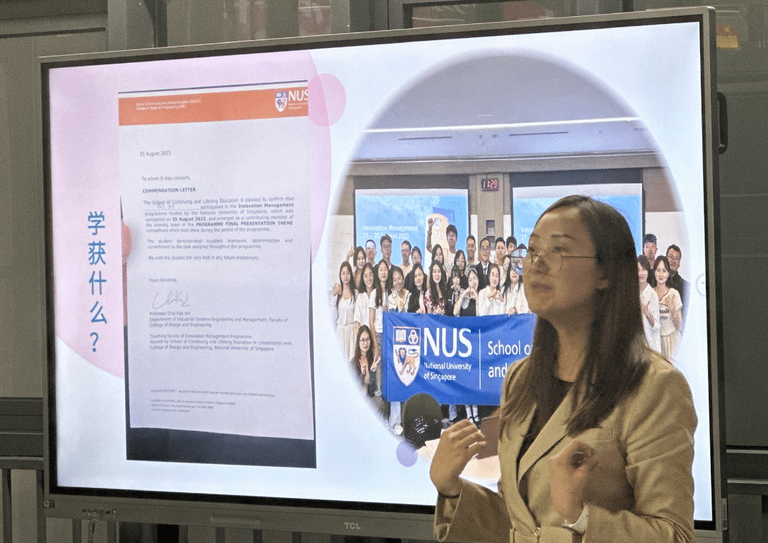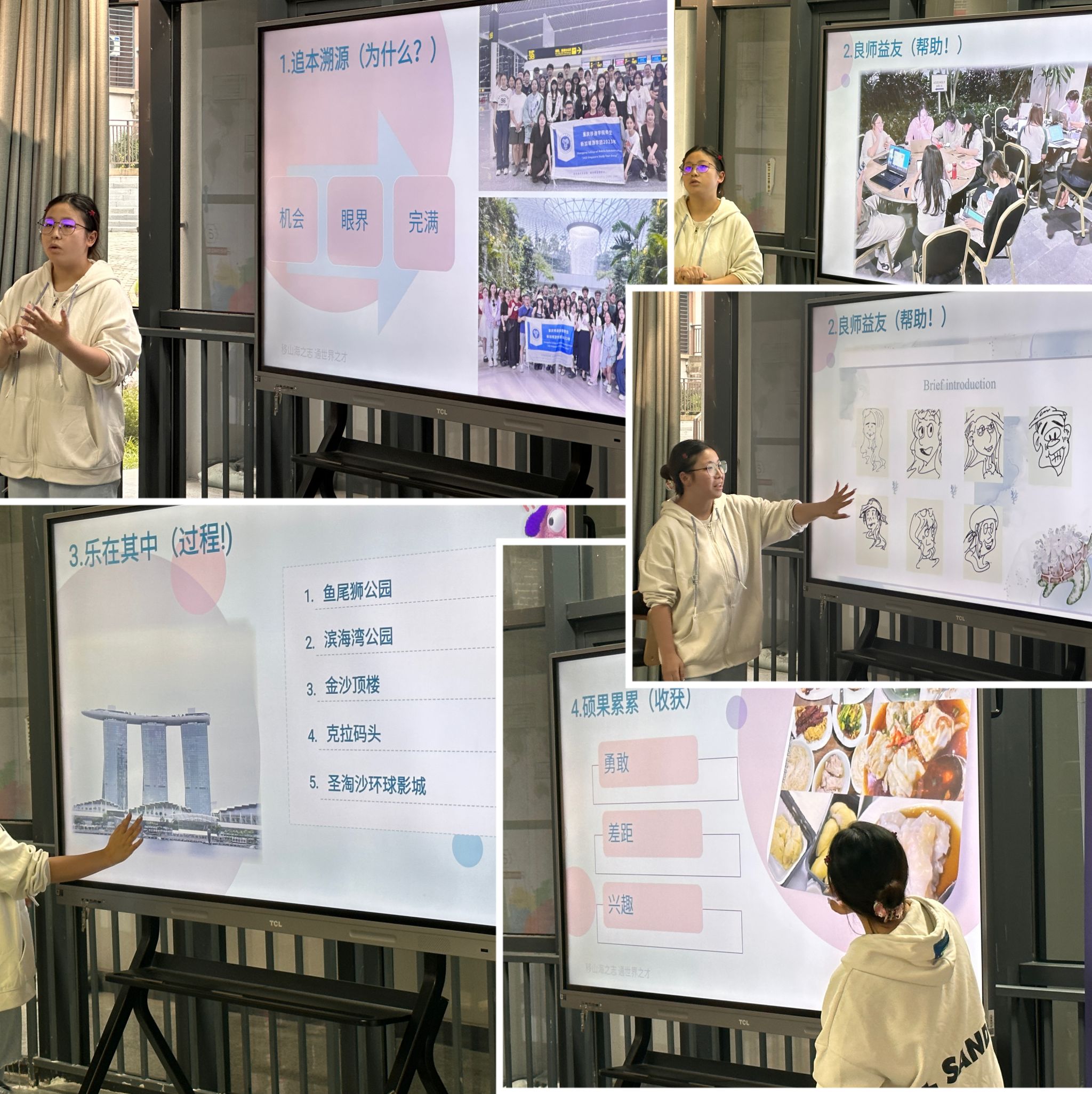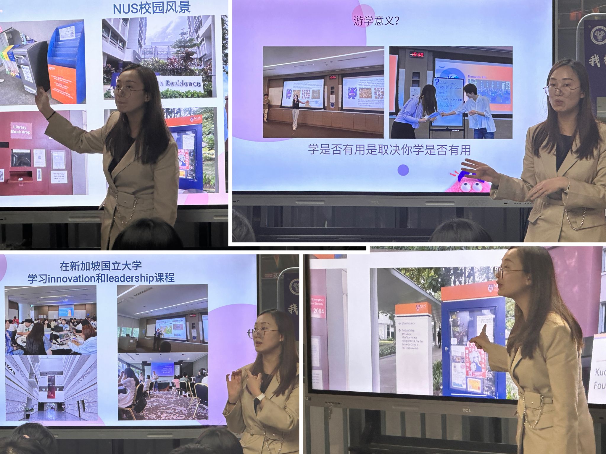 活动初始,出国学生代表邓丽从追本溯源,良师益友,乐在其中,硕果累累四个方面分享了新加坡研学经历。