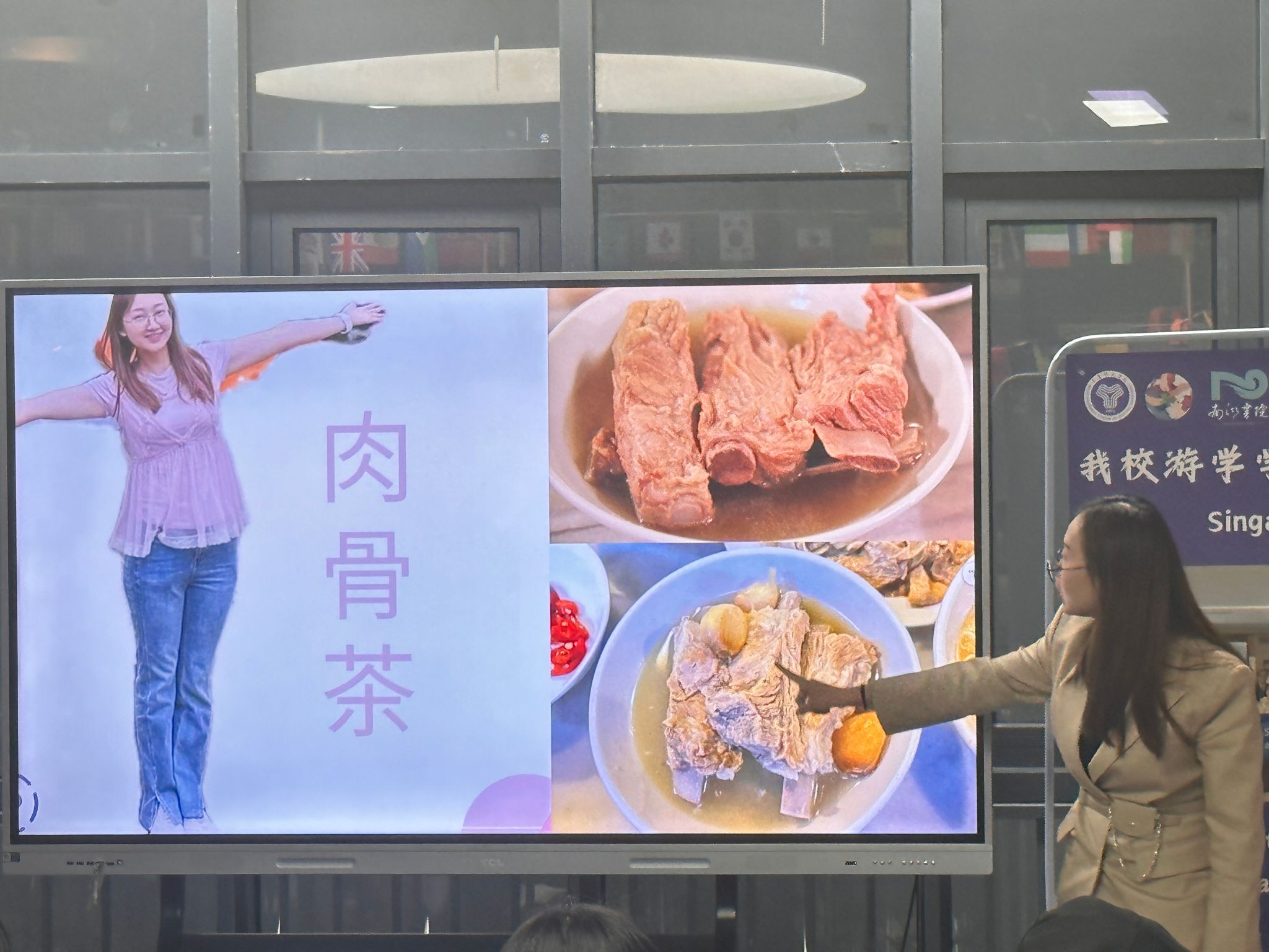在分享会的后半部分时间,齐老师向同学们介绍了新加坡的特色美食——肉骨茶,同时也将用从新加坡带回国的肉骨茶调料包烹饪而成的肉骨茶与同学们分享。