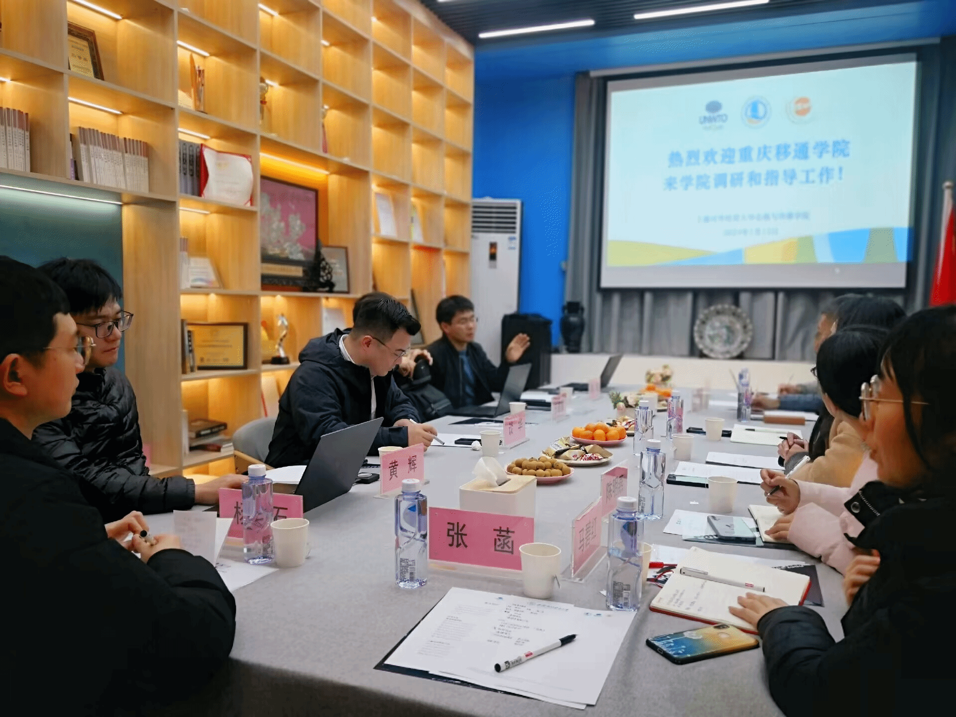 在这次交流中,上海对外经贸大学会展与传播学院经济与管理系支部书记蔡萌博士对学院的学科建设、师资力量和人才培养特色进行了深入分享。蔡萌博士特别指出,学院注重“三地一库”的建设。接着,重庆移通学院数字经济与信息管理学院潘显兵院长详细介绍了我校的办学规模、人才培养方案以及学生就业情况。他特别强调了集团 实施“四位一体双院制”人才培养模式和培养数字经济时代高情商综合能力强的经营管理型人才培养特色以及学院各个专业的建设情况。