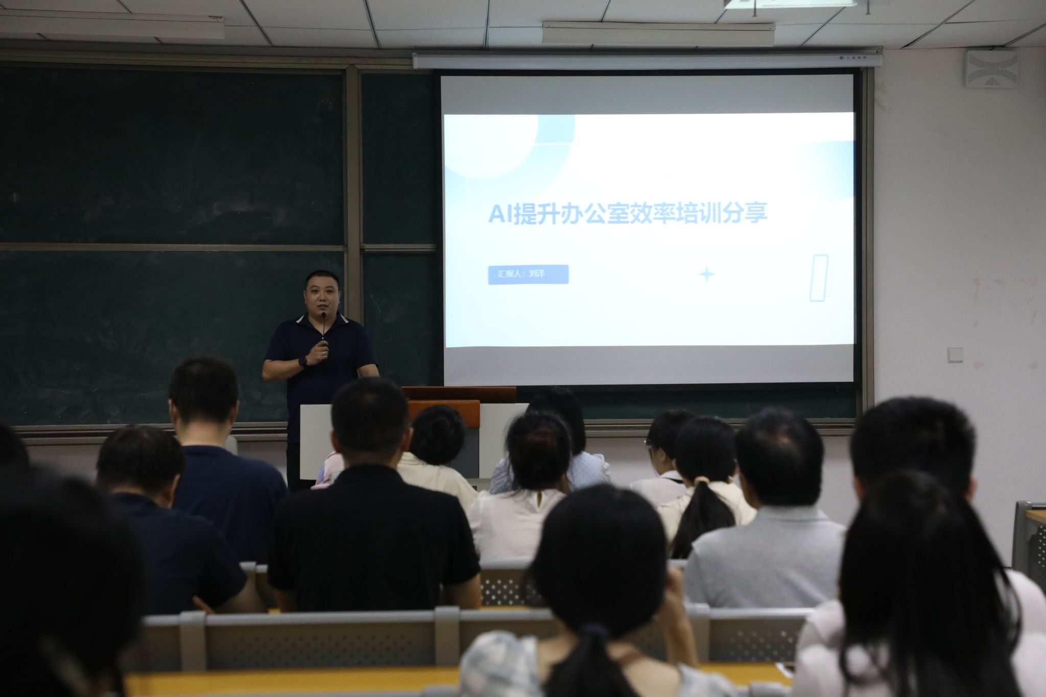 随后,由行政主管刘洋老师对“AI提升办公室效率培训”进行分享。刘洋老师首先概述了AI技术如何逐步渗透并改变着传统办公模式,强调了AI在提升工作效率、优化资源配置方面的重要作用。随后,他通过现场实操,展示了AI在文件处理、会议安排、日程管理等多个环节中应用,显著提高了办公室工作的效率与精确度,并介绍多款实用AI工具助力教职工智能化办公。刘洋老师表示,随着AI技术的不断成熟与普及,其在办公领域的应用前景将更加广阔,鼓励大家积极尝试新技术,推动教师在教学与办公等工作的智能化、高效化。