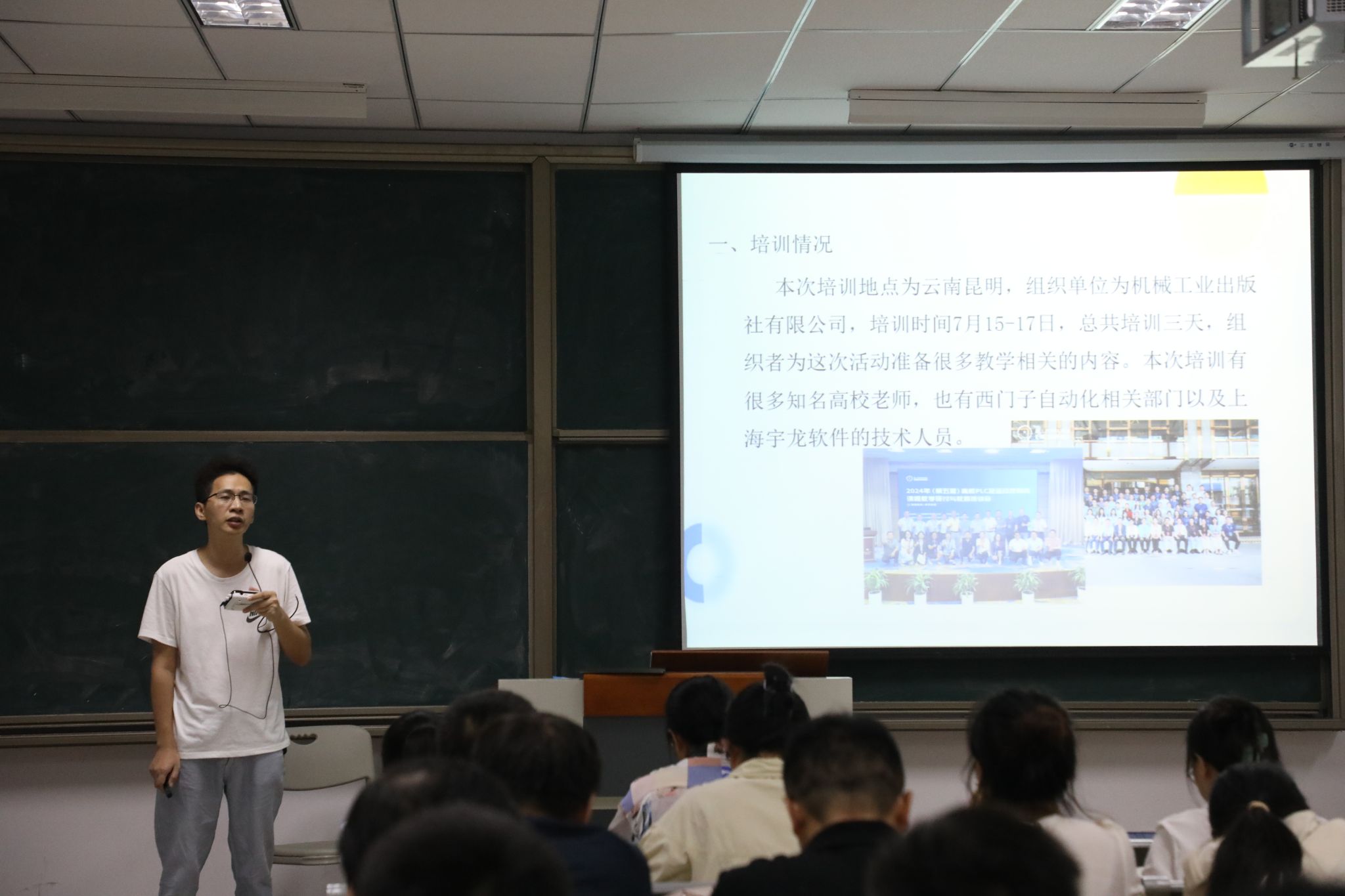 随后,智能控制教研室的李文兴老师就暑期参与的“高校PLC及运动控制类课程教学研讨培训成果”进行了汇报。李老师表示,此次培训不仅让他对PLC及运动控制教学有了更为透彻地理解,还前瞻性地预见到机电自动化控制领域即将迎来的技术革新浪潮。他强调,高质量地传授自动化控制知识,离不开跨学科专业的紧密协作,并敏锐地洞察到随着社会进步,新兴产业及高技术人才正迫切需求。通过此次培训中的广泛交流,李老师深切感受到来自不同院校同行们的先进教学理念与方法,为进一步提升自身教学水平及适应行业变革提供了宝贵启示。
