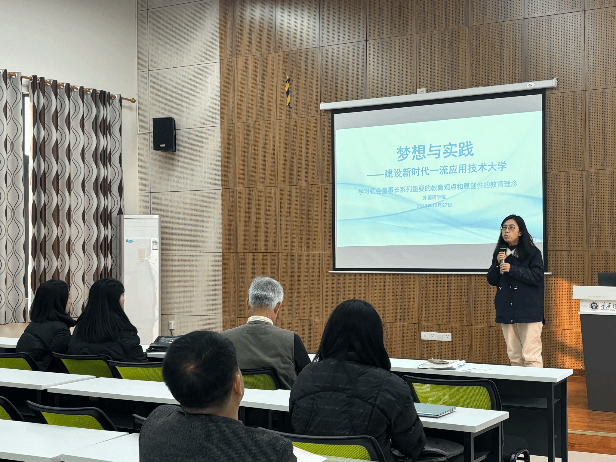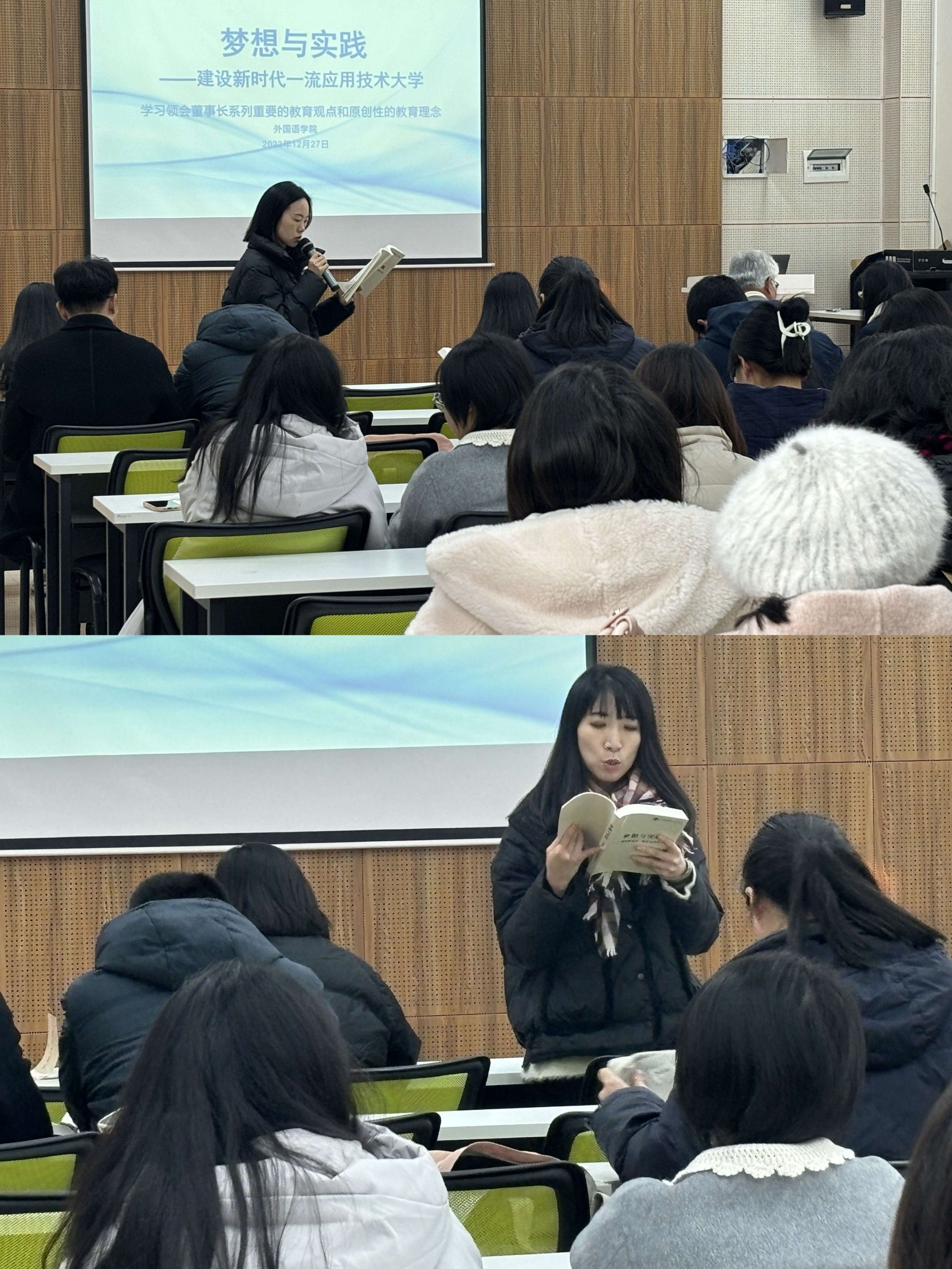 为深入学习领悟董事长提出的五年内成为中国最受尊崇的民办大学的伟大愿景及其培养数字经济时代的高情商经营管理人才的办学理念,进一步积极推进落实四位一体双院制人才培养模式,12月27日下午4点,外国语学院在天渠书院111阅览室召开《梦想与实践——建设新时代一流应用技术大学》读书分享会。会议由外国语学院副院长罗琳主持,外国语学院全体教职工参加。