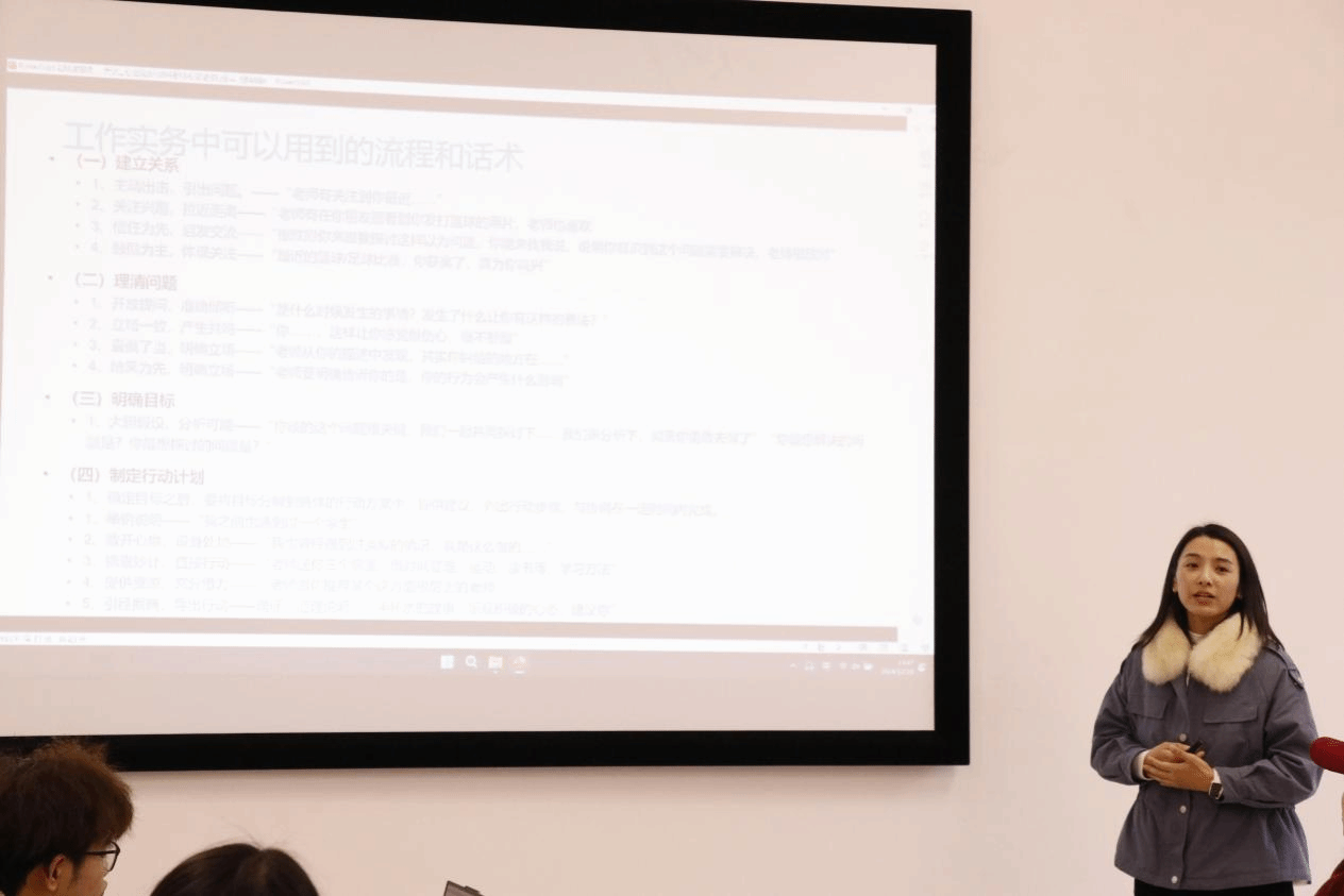 在培训会上,张颖超老师围绕大学生心理健康问题谈心谈话技巧进行了深入分享。她首先强调了谈心谈话在心理健康教育中的重要性,并详细讲解了谈话前的准备、谈话技巧、谈话流程以及谈话后的跟进工作。张老师结合自己多年的学生工作经验和心理咨询师实践经验,分享了一些实用的日常话术和案例分析方法,为现场的老师们提供了宝贵的经验和启示。她指出,谈心谈话不仅要有耐心和细心,更要注重方法和技巧,只有这样才能真正走进学生的内心世界,帮助他们解决心理问题。