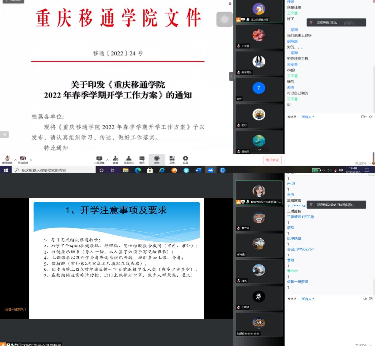 花开在春天,读书在校园,转眼寒假已完结,新学期的列车已然到站。为顺利做好开学的各项工作,数字经济与信息学院全体辅导员老师们严格按照开学的相关要求以多样形式积极开展“开学第一课”,同时老师们对于寒假研修计划进行线下交流,分享了各自的收获与好的创意想法,以期在新学期更好的主动成长。