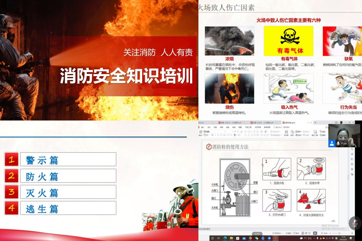 “预防为主、防消结合”、“防患于未然”是做好消防工作的基本方针;培训全体师生的消防观念,强化消防安全防范意识,是建立和谐、安全、稳定的校园的重要一环。学院老师分别从警示篇、防火篇、灭火篇、逃生篇4个方面对同学们进行了简短的消防安全知识讲解,内容涉及火灾发生的原因、怎样预防火灾发生、火场逃生基本知识、灭火器的正确使用以及正确报警等方面,向大家传授关于消防的各种安全防范知识,例举真实案例,通过培训使同学们更多的了解消防知识,进一步增强安全防范意识。