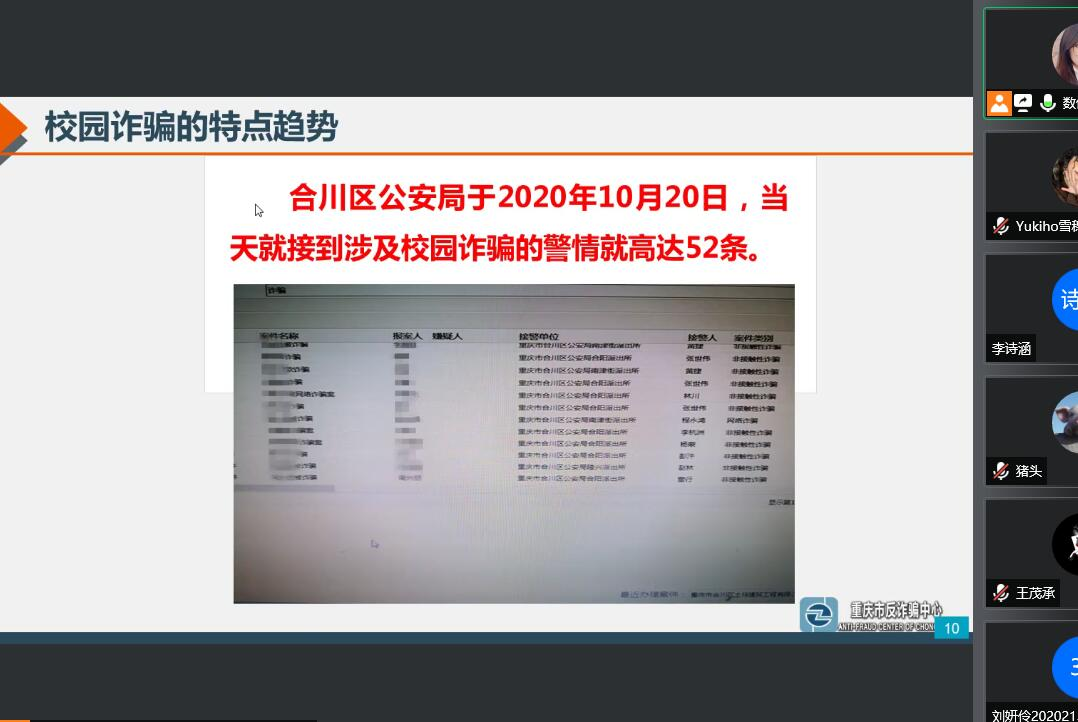 随着社会发展和信息技术的进步,各种诈骗现象也成为社会日益突出的问题,一些诈骗分子将目标转向思想单纯、社会经验不足的大学生,大学生本身并没有成熟的独立思考和辨识能力,容易受到他人别有用心的欺骗。骗局层出不穷,即使在校园,也无法完全避免,如2017年10月,19岁大二学生杨同学虚荣心想购买苹果6手机,受别人诱导使用高利贷款,最终欠下多家公司70多万元,学院老师通过一件件发生在身边的真实案例,告诫学生应当树立安全防范意识,做到自我保护,维护自我权利。