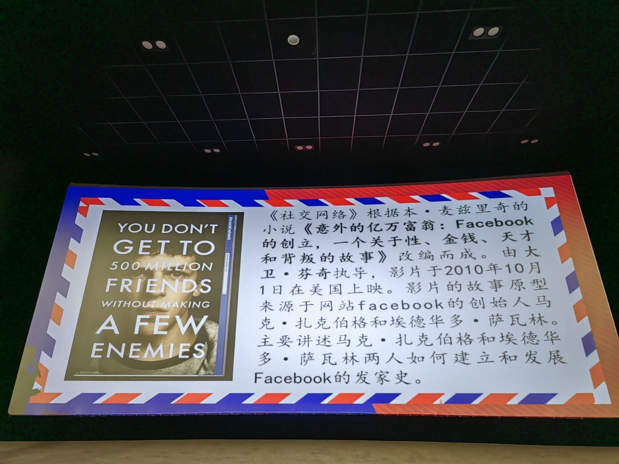 何老师首先为大家介绍了本次电影《社交网络》的导演:大卫·芬奇。大卫·芬奇是美国著名的电影导演,他的电影作品有着鲜明的个人风格,《七宗罪》《搏击俱乐部》《本杰明·巴顿传奇》《社交网络》《消失的爱人》等多部影片被奉为经典之作,深受影迷的喜爱。大卫·芬奇被誉为奥斯卡的无冕之王,他的电影曾多次获奥斯卡金像奖或提名奖。