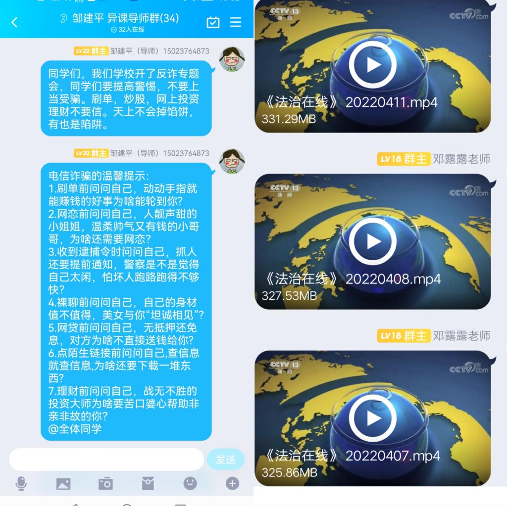 思政教学部邹建平老师和通识教学部邓露露老师分别在班级群中对学生们进行了一场防诈宣传,其中,邹建平老师通过“刷单前问问自己,动动手指就能赚钱的好事为啥能轮到你?”“理财前问问自己,战无不胜的投资大师为啥要苦口婆心帮助非亲非故的你?”等一系列的疑问句引发学生思考,来对学生们进行电信诈骗的温馨提示。邓露露老师不仅在班级群中发送了一些预防电信诈骗的小知识,还发送了一些与网络诈骗有关的小视频,提醒学生们增强防范意识,坚信天上不会掉馅饼。