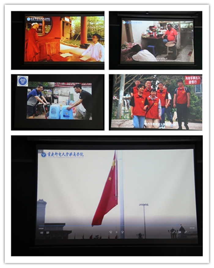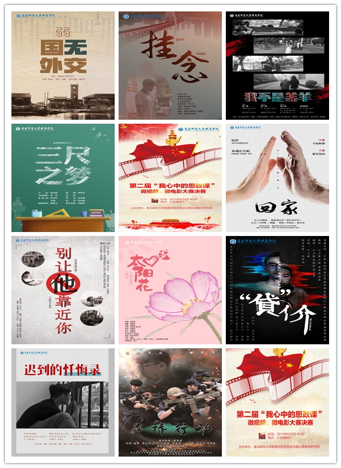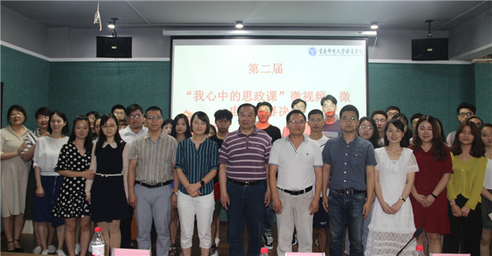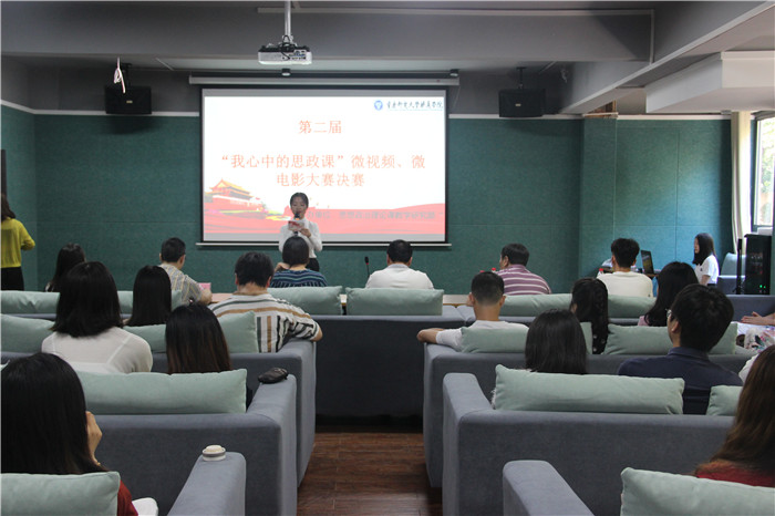 为全面推动习近平新时代中国特色社会主义思想进教材、进课堂、进头脑,着力推动思政课在改进中加强、在创新中提高,切实增强学生对思政课的获得感,落实“立德树人”的根本任务,鼓励学生以鲜活的微视频语言生动诠释和传播社会主义核心价值观,为实现中国梦聚集青春正能量。6月5日下午16:10,由思政教学部举办的第二届“我心中的思政课”微视频、微电影大赛决赛在爱莲书院多功能影音室拉开帷幕。这既是《思想道德修养与法律基础》、《马克思主义基本原理》、《中国近现代史纲要》和《毛泽东思想和中国特色社会主义理论体系概论》四门思政课程实践教学成果的一场展示,更是学校“大思政”育人格局的一次检验。重庆邮电大学移通学院宣传新闻中心主任苏述庚、重庆师范大学涉外商贸学院政治课教学部部长田川、我校思政教学部主任邓燕、思政教学部教授刘宗粤担任评委,思政教学部全体教师及学生参赛团队观看了大赛。