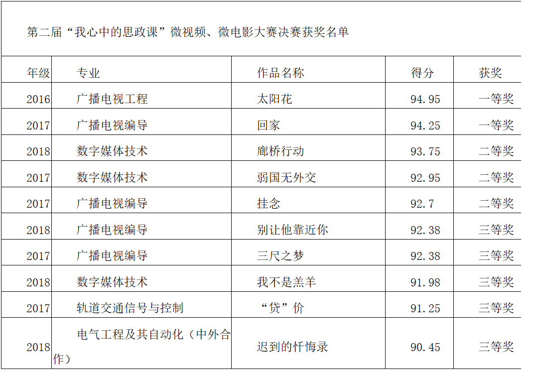 经过评委的认真评选,《太阳花》、《回家》荣获大赛一等奖,《廊桥行动》等三部作品荣获二等奖,《别让他靠近你》等五部作品荣获三等奖。本次微视频、微电影大赛的成功举办,体现了我校思政教学部在思政课理论教学和实践教学融合改革上已初显成效。本次活动以微视频、微电影为载体给思政课插上艺术翅膀,努力推动思政课在思想性、理论性、亲和力和针对性等方面开拓新境界,让思政课不仅有意义,也更有意思。