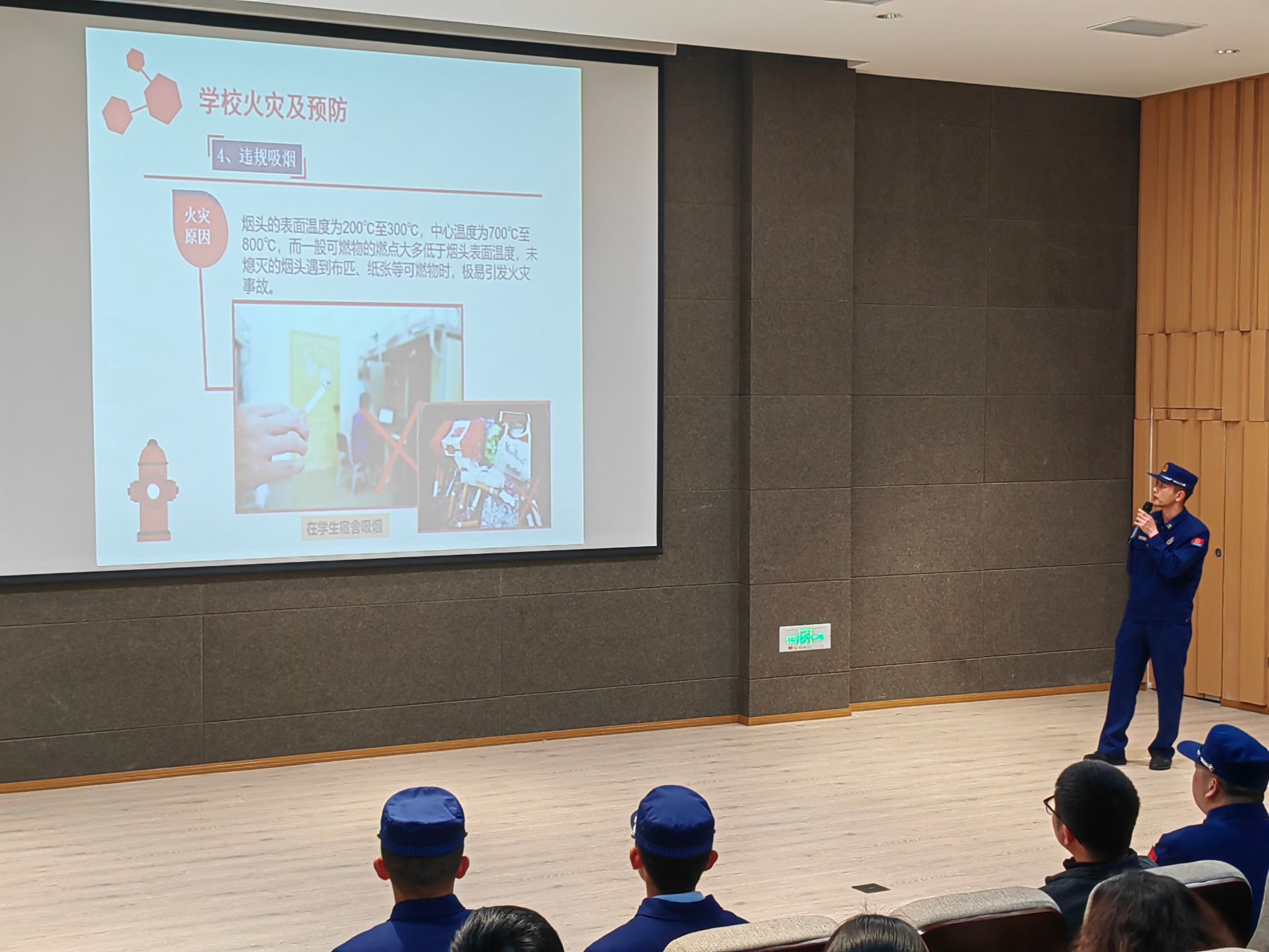 消防讲座开始,合川区消防救援支队花滩特勤站的的刘川银同志围绕火灾案例从初期火灾识别、火情防控措施、逃生知识、消防器材的认识、不同情况下的灭火方法及注意事项、校园火灾隐患、应急自救常识等方面进行了深入浅出的讲解,通俗易懂,具有较高的实用性和可操作性。