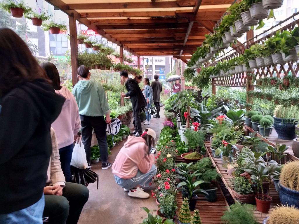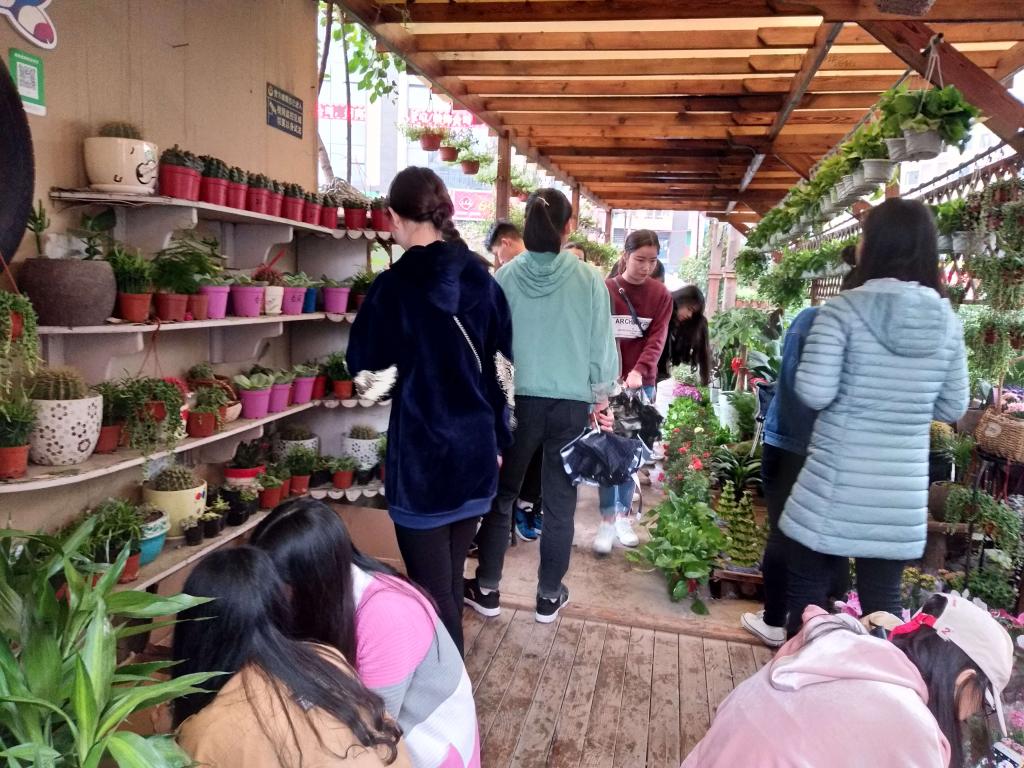 花圃之旅的第一站是在一个喧嚣的市场。叫卖、还价声此起彼伏,市场里到处是忙碌的气息。在社长的指领下,社员们来到一间门前摆满了绿色植物的花店。进入花室,“苔痕上阶绿,草色入帘青”,令人浮躁的心渐渐平静。粉红色的芍药花怒放着,艳丽与清雅并存,娉婷婀娜;五彩的虞美人妩媚秀丽,百媚千娇,令人陶醉;更有盛开的金盏菊犹如一个个小太阳,给人以希望与光芒。不同品种的花卉共同生长着,共同营造出了一个花的世界,让人叹为观止。对于一些不太懂的花卉,社员们则使用识图软件进行查找以加强了解。此外社员们也会主动请教社长和花农一些花卉的基本信息及培养方法。大家因相同的兴趣齐聚于此,共拾宝贵的知识财富。