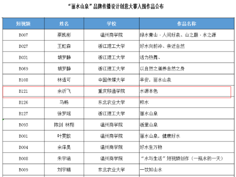 近日,在刚结束不久的向全球高校征集创意设计的“丽水山泉”品牌传播设计创意大赛中,中德学院2020级工商企业管理专业余沂飞同学制作的短视频成功从1000多份投稿作品中脱颖而出,被评定为150份入围作品之一。据悉,此次入围的150份作品中,产品设计27份,海报设计40份,短视频33份,宣传语25份,长文案35份。