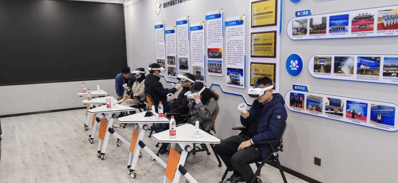 此次调研以VR情景实验室和智慧语言课堂的基础设施建设为重点,旨在深入了解先进技术如何在语言学习与教学实践中发挥作用。吴世银院长在调研中指出:“四川外国语大学的VR和智慧语言实验室完美诠释了AI时代语言教学中人机融合的发展趋势。通过有效利用这些前沿技术,语言教学将焕发更大的活力,为学生提供更高效的学习体验。”他进一步强调,这一系列技术的创新应用,不仅推动了传统语言教学模式的变革,还为培养具有国际视野和实践能力的外语人才提供了坚实支撑。