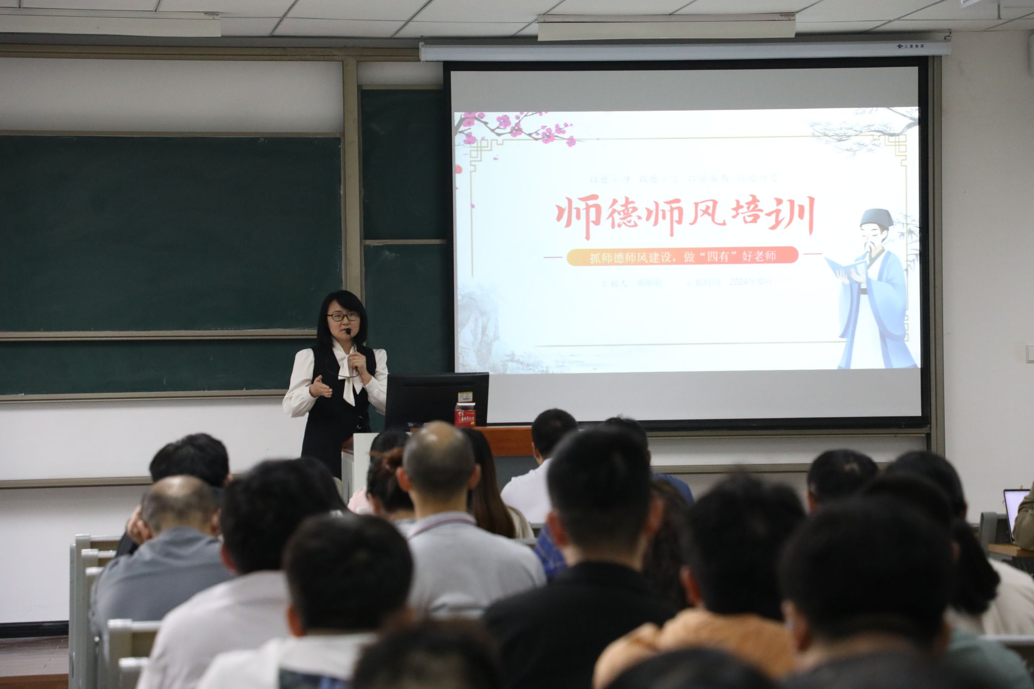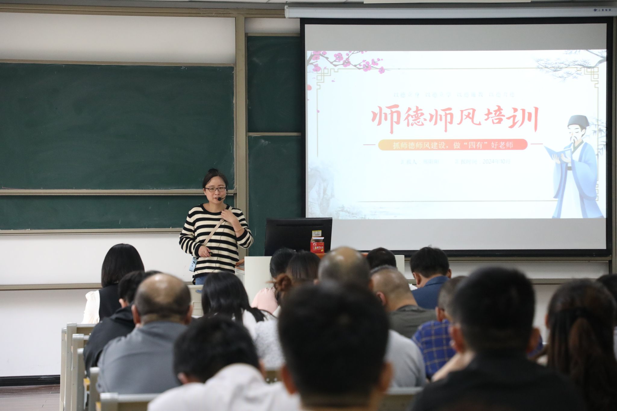 随后,由邢阳阳老师分享题为《抓师德师风建设,做“四有”好老师》的专题讲座。她首先阐述了新时代下师德师风的重要性和内涵,指出在新时代背景下,教师不仅要具备扎实的专业知识和教学技能,更要树立正确的世界观、人生观和价值观,以身作则、言传身教,为学生树立良好的榜样。接着,邢老师详细列举了违反师德师风的各种表现,爱岗敬业精神弱化、价值取向功利化和世俗化、行为规范不严和师表形象模糊化,以及典型的违反师德师风现象,并深刻剖析了这些行为对学生、家长以及社会造成的负面影响。并强调,作为教师,必须时刻保持清醒的头脑,坚守职业道德底线,坚决杜绝任何违反师德师风的行为。为了增强讲座的针对性和实效性,邢老师还列举了一些违反师德师风的典型案例,并进行了深入剖析,希望全体教师能够从中汲取教训,引以为戒,时刻警醒自己。在解读教师行为规范部分,强调要以《教师行为六禁令》《教师行为十项准则》和《教师行为红七条》作为不可逾越的底线,并为在场教师解读《重庆移通学院教师行业规范》《重庆移通学院学术道德规范及实施办法》等纲领性文件,同时强调,作为教师,必须严格遵守职业道德规范,做到爱岗敬业、关爱学生、教书育人、为人师表。最后,邢老师围绕如何做“四有好老师”、当“育人大先生”这一主题进行了深入讲解,希望全体教师能够不断提高自身的专业素养和师德修养,努力成为“四有好老师”、当“育人大先生”。