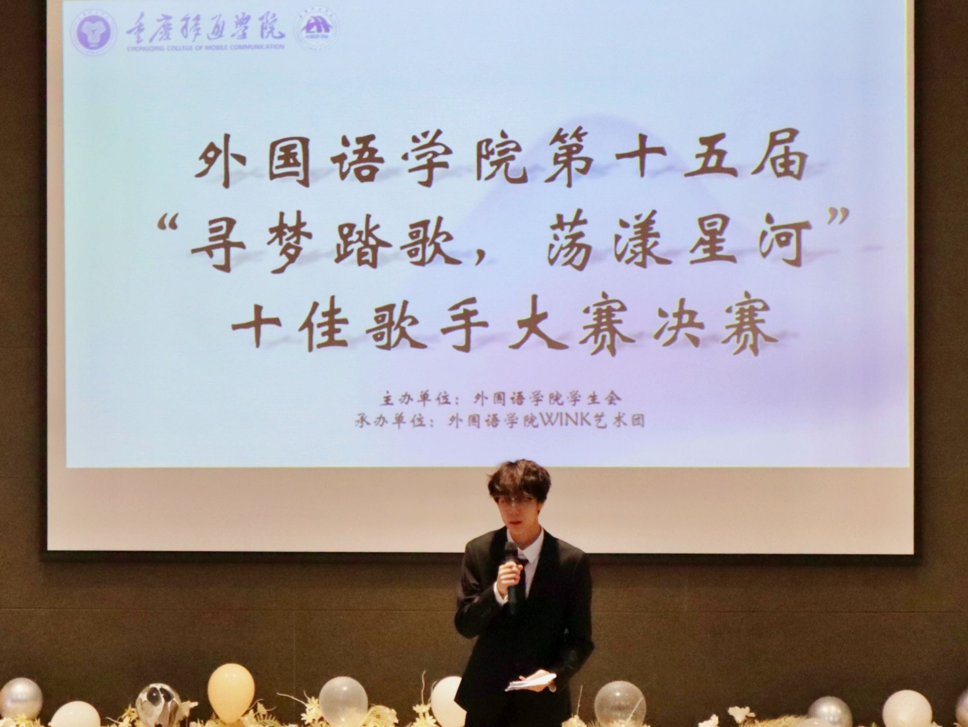 九秩芳华始为序,循歌踏迹逐梦来。为丰富校园文化生活,营造积极向上的校园文化艺术氛围,实现以美育人,以美化人,外国语学院学生会WINK艺术团于10月16日16:30在六度空间无限多功能厅举行外国语学院第十五届“寻梦踏歌,荡漾星河”十佳歌手大赛决赛。