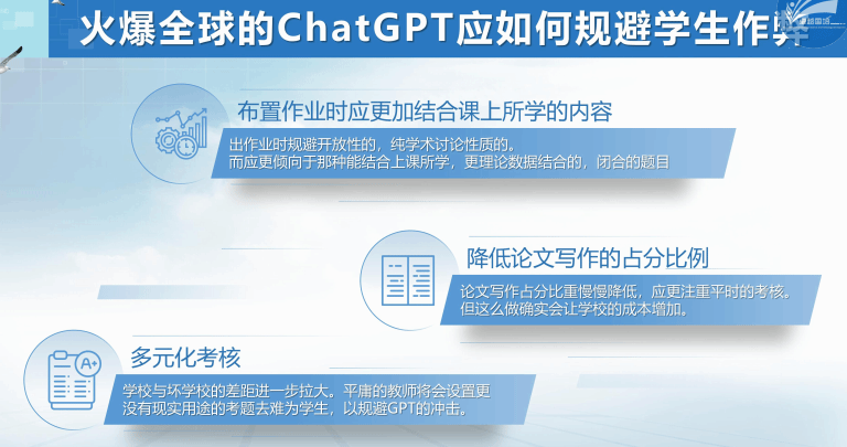 针对这些挑战,赖教授提出了一系列切实可行的实践建议。他建议设计更具针对性的作业和考核方式,降低论文写作在总评分中的比重,更注重平时的考核。同时,他鼓励教师们积极利用ChatGPT等工具进行教学创新,同时保持对学生学术诚信的严格要求,确保教育教学的质量和效果。