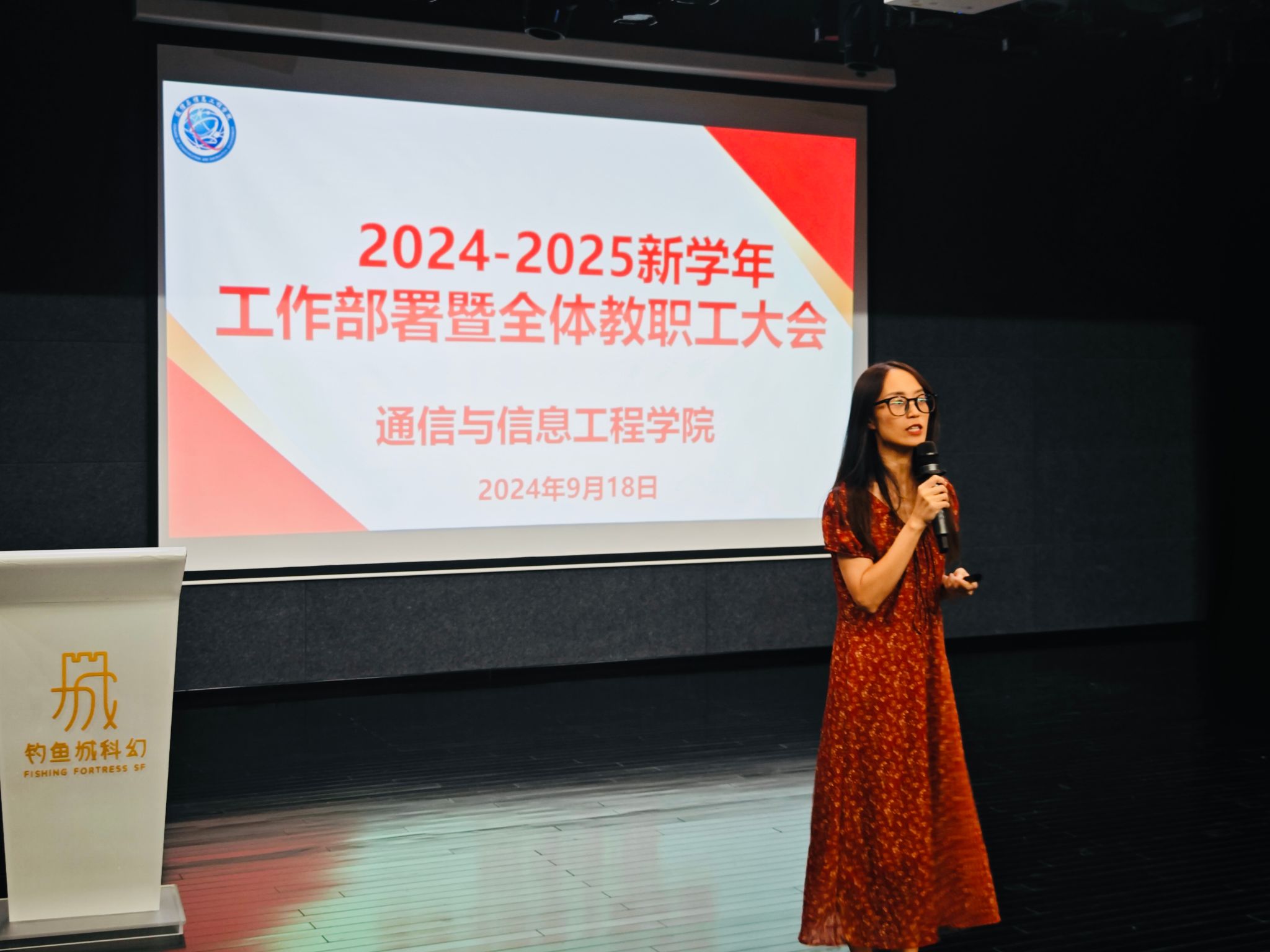 为进一步凝聚全院师生的力量,共同明确和锚定学院新学期的发展方向,9月18日下午,通信与信息工程学院在六度空间的黑匣子剧场召开了2024-2025新学年工作部署暨全体教职工大会。此次会议由通信与信息工程学院院长李文娟主持,学院全体教师和辅导员参加。