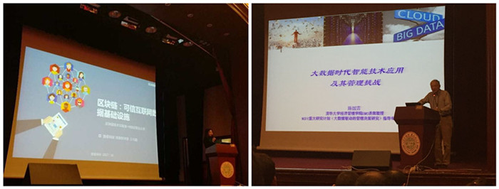 本次高峰论坛,各专家就大数据、人工智能、区块链、数字化转型等问题进行了探讨。教育部管理科学与工程专业教学指导委员会主任、清华大学经济管理学院学术委员会主任、EMC讲席教授、NSFC重大研究计划(大数据驱动的管理决策研究)指导专家组组长陈国青教授、香港城市大学信息系统系主任赵建良、香港城市大学信息系统系荣誉教授、深圳正今金融创新研究院院长王怀清、工业与信息化部信息化推进联盟区块链实验室副主任、数秦科技首席科学家王毛路、联想云高级副总裁高志国等嘉宾分别做了主题分享报告。涉及从大数据时代智能技术应用及其管理挑战、智能互联网时代的商务分析师教育探索、培养人工智能+信息系统复合型人才、区块链可信互联网数据基础设施、智能时代的IT创新之路等内容。其中,陈国青教授分别从时代背景、智能技术应用和AI管理挑战三个方面进行了阐述,提出了以感测与连接为基础的物联网,以数据中心与效能为目标的云计算,以商务分析与智能为应用的大数据的结合和发展,讲述了数字化生活的中大数据问题的特征,强调了社会“像素”高度控制的时代下应该重点关注数字“成像”的技术,不断应用于生活和管理当中。