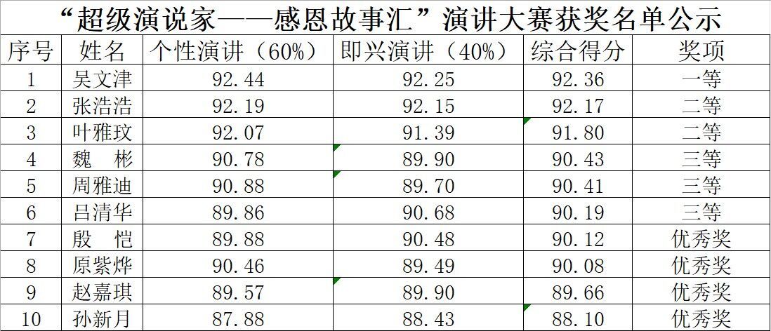 有幸作为一名观众观看“超级演说家——感恩故事汇”演讲大赛决赛,比赛中每个选手都为我们带来了生活中一个又一个鲜活的志愿故事。在每个不起眼的角落里,正是这些不起眼的小事,经过选手们发自内心的激情演讲,让观众们全都身临其境的感觉到志愿活动在我们日常生活中的正能量。