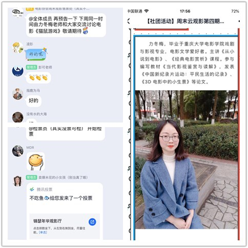 线上观影结束后,力老师与同学们借助网络平台对电影进行映后分享。在映后讨论中,力老师以问题意识为导向与学生们交流,让学生对该作品有了深度地讨论和理解,并向同学们提出了两个问题:1、《猫鼠游戏》的多角度分析,2、《猫鼠游戏》的主题与意义,同学们对以上两个问题进行了认真地思考与讨论之后,力老师做了较为全面的分析和总结,使师生间的交流充实而愉快。
