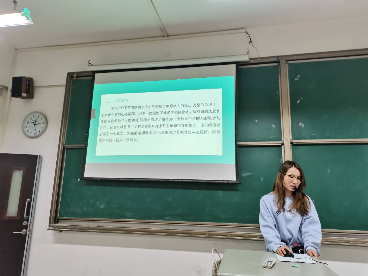 秦老师首先对书名、作者以及目录进行了系统介绍,讲述了该书的主要内容,同时分享了自己的感受。该书主要讲述了格力集团“铁娘子”董明珠的辉煌的人生履历以及心路历程。董明珠经历了几次风浪,也收获了很多成果,最后成长为格力的一把手。她的成功,在于她对梦想的追求,对信仰的坚持。本书展现了一个拥有崇高信仰的女人,她身处波诡云谲的商场却能时刻保持冷静和智慧,在浮躁的社会里,坚定不移地追求着自己的人生目标,可敬、可佩。她的经历展现出了一种特别的女性的力量,值得我们去学习。