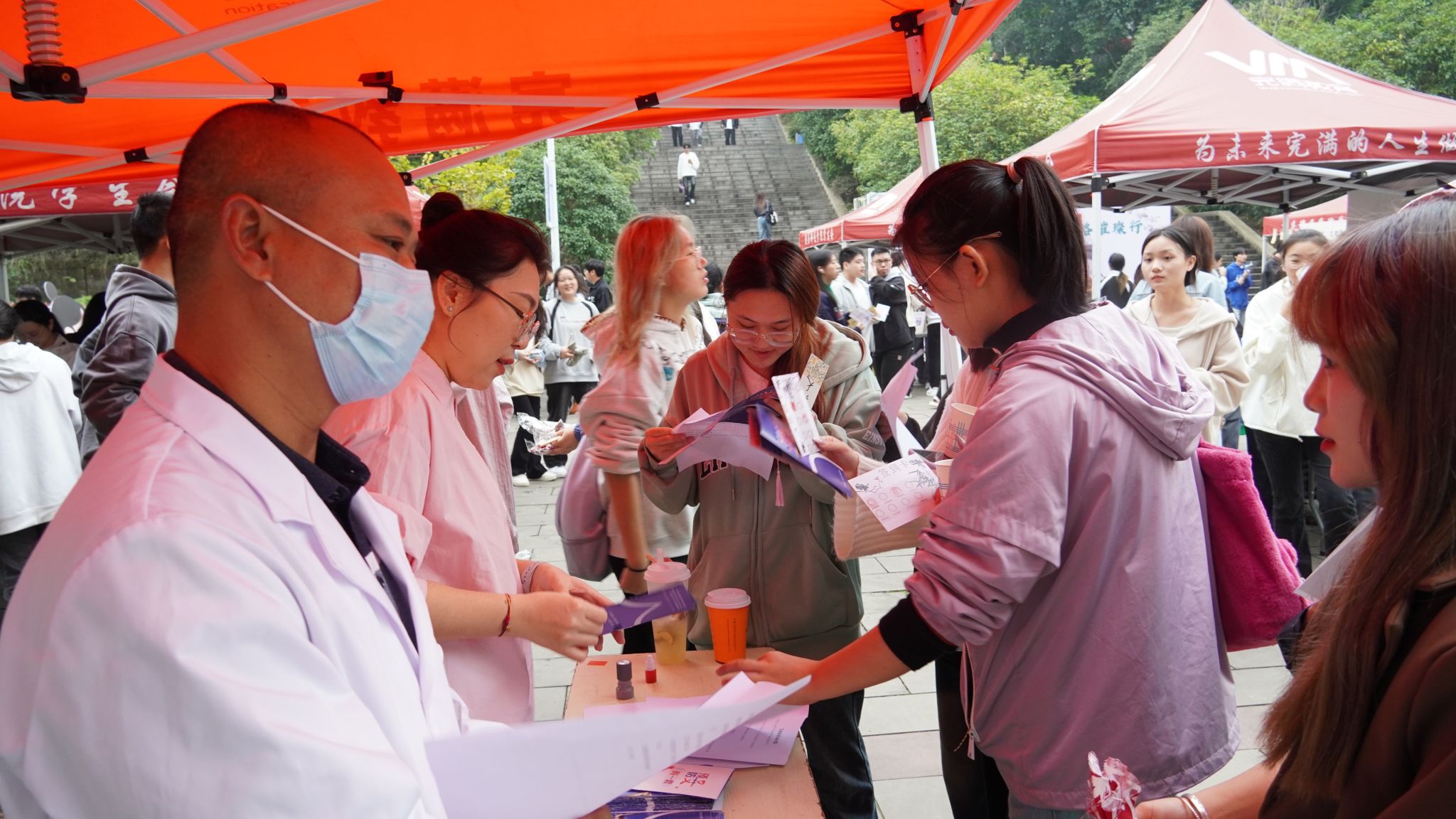 在义诊区域,特邀嘉宾:黄爽、周军、陈晓庆、吴虹君、陈英杰、秦建川等中医师化身为“健康守护神”,用他们精湛的医术和温暖的笑容,为同学们送上一份份定制的养生秘籍。同学们排起长队,争相与医生交流,仿佛在进行一场关于健康的深度对话。