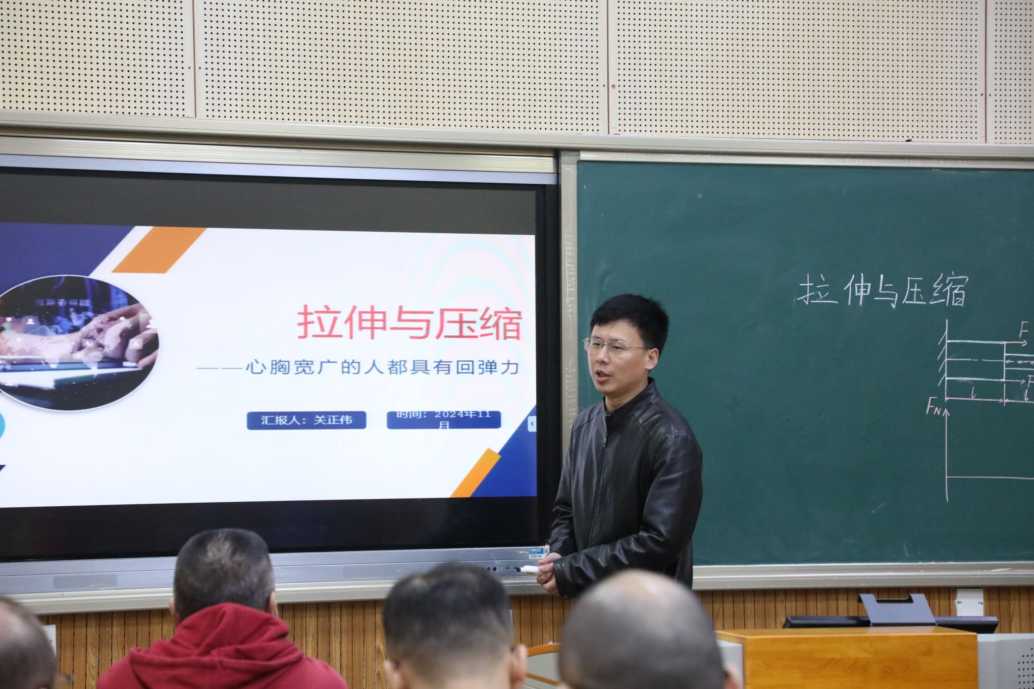 活动伊始,一场别开生面的课程导入拉开序幕。在本次示范课中,关正伟老师以实物皮筋为引子,巧妙地将“拉伸与压缩”这一主题引入课堂,瞬间点燃了大家的好奇心。他深入浅出地剖析了横截面内力的奥秘,通过分段讲解与互动绘图,引导大家一步步构建起轴力图的认知框架。随后,关老师以木桶理论为喻,生动诠释了横截面应力的概念,并巧妙融入静力学知识,通过即时课堂练习让学生在实践中深化理解。