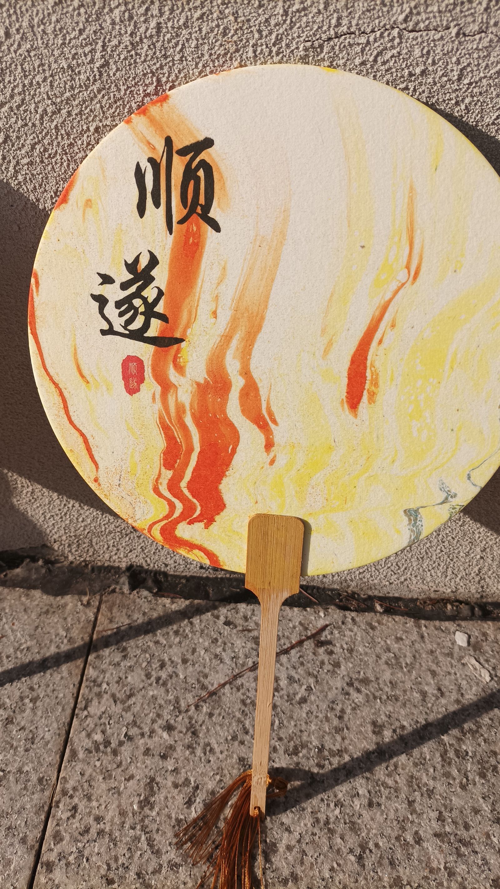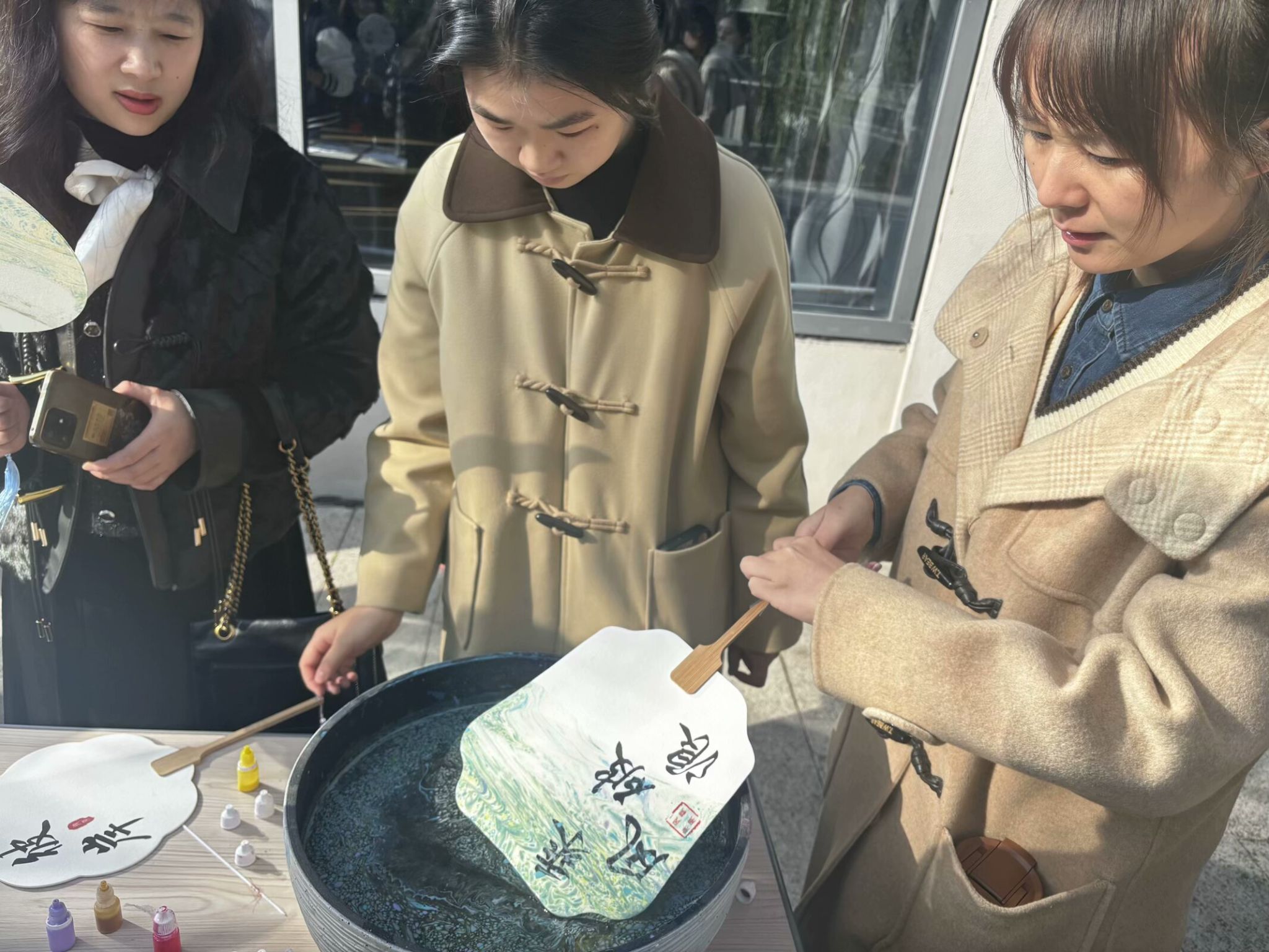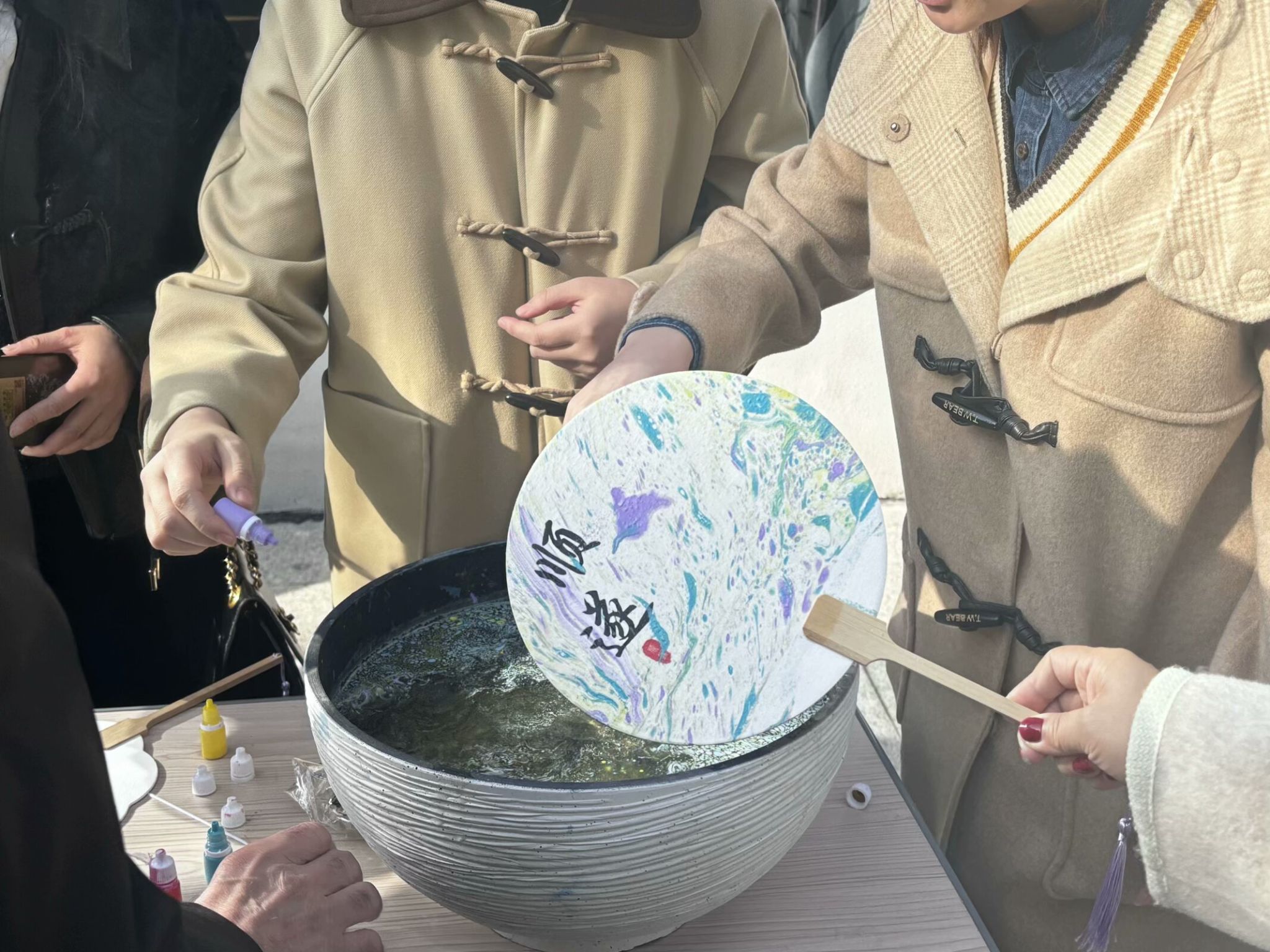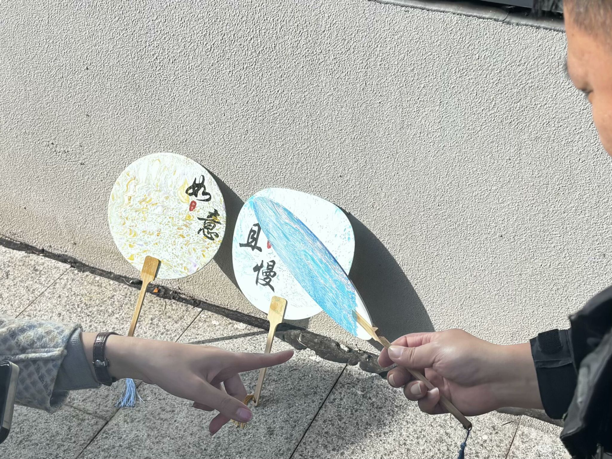 教师选择自己心仪的纸扇以及颜色,制作一把属于自己的漆扇。选自己喜欢的颜色滴入水中,搅拌成不同形状,灵巧地将扇子沉入水中,蘸取色彩于扇面,使扇子悠然跃出水面,得一把巧夺天工之扇。晾晒与墙根处,与艳阳相得益彰。