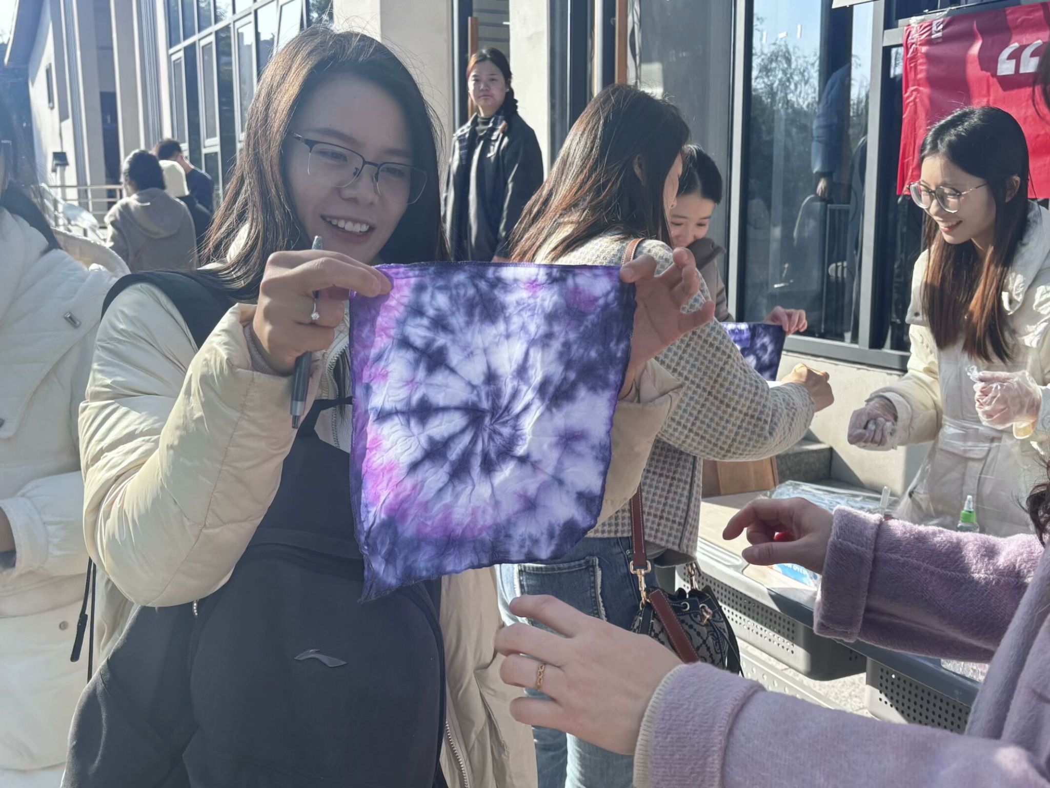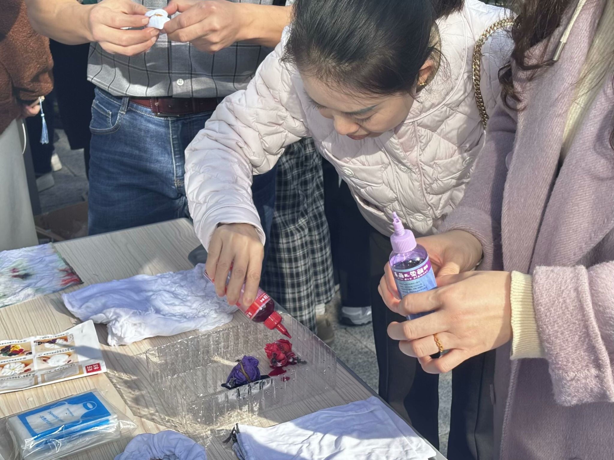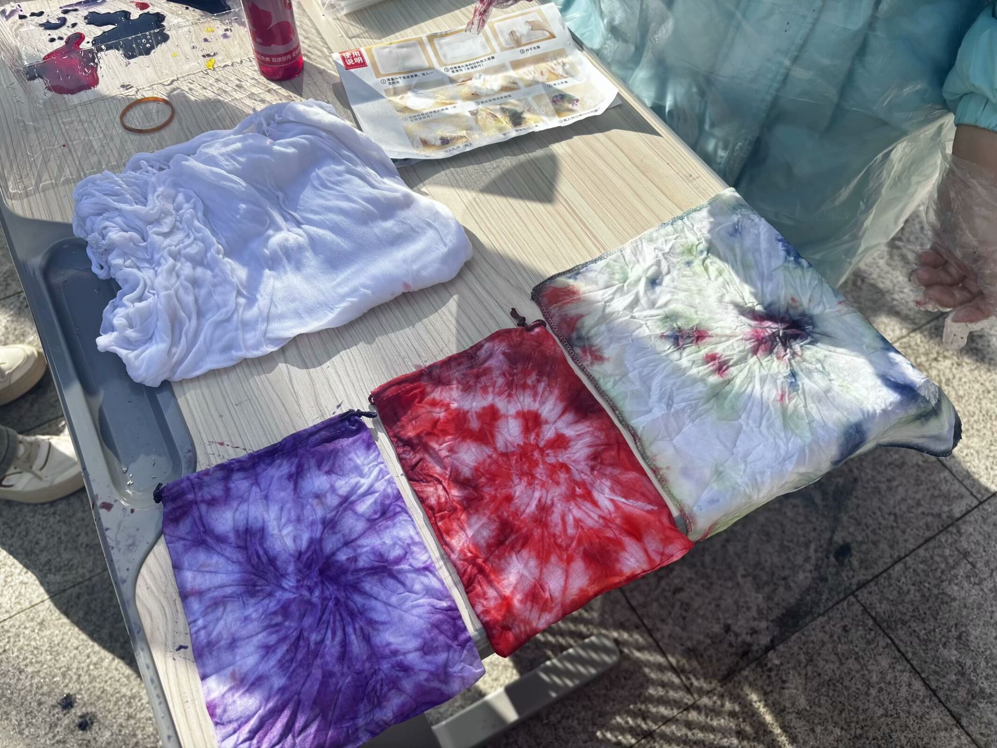织物在染色时部分扎起来使之不能着色的一种染色方法,是中国民间传统而独特的染色工艺之一。教师将手帕折叠出各种形状,用橡皮筋扎牢,涂上染料,创造出独一无二的样式造型。老师们发挥自己的想象力,缠绕手帕,并点上所选取的色彩,缓缓滴下,静静等待,片刻之余绚烂绽放,见者手舞足蹈,大家投去艳羡的目光,拍手叫好。