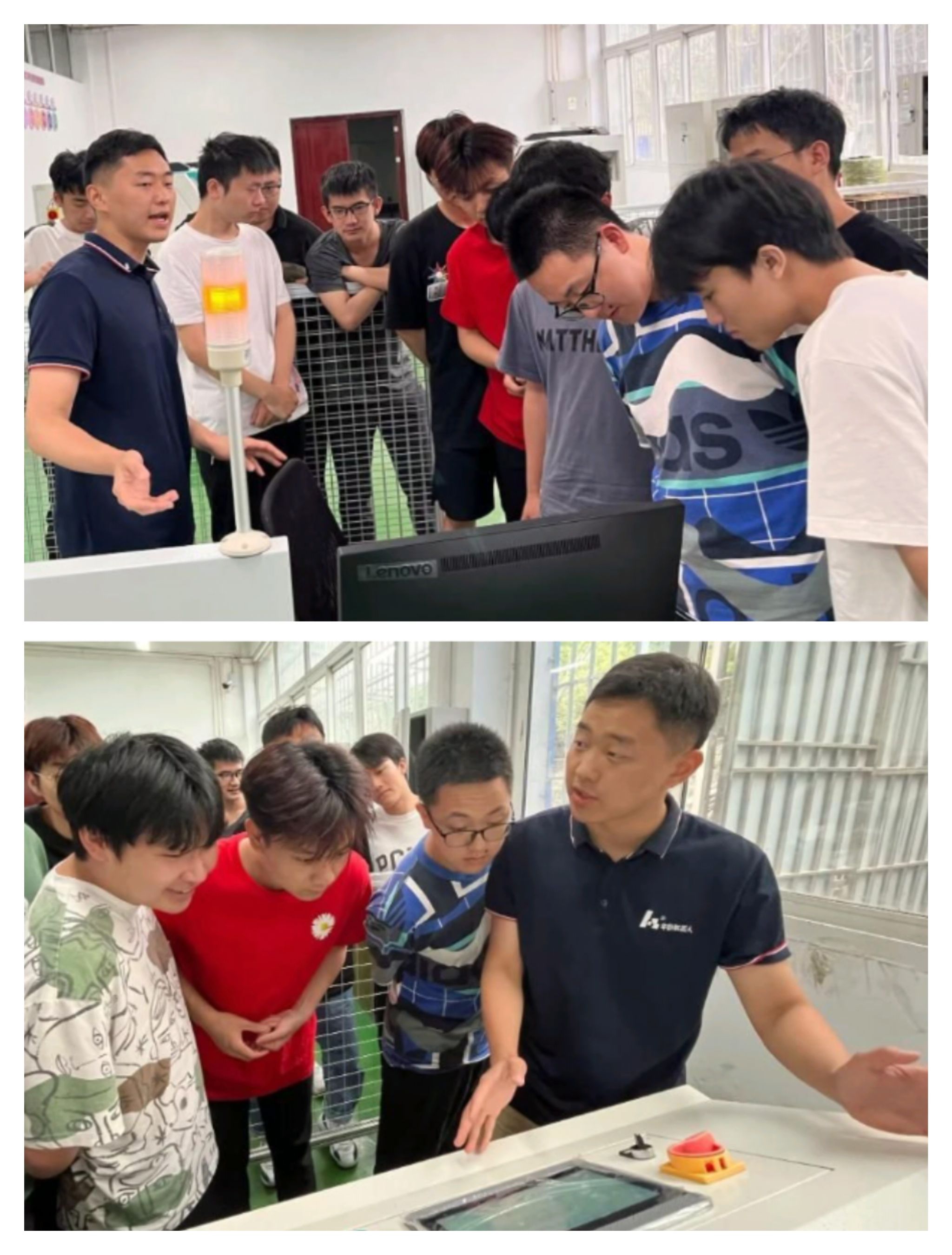 在《智能制造项目实践》课程中,周江平工程师以其丰富的行业经验,向同学们深入讲解了智能产线教学实训平台。从智能仓库、智能搬运、加工中心到镭雕、装配、拧紧、视觉等工业机器人,周工都为同学们做了详细演示及讲解。同时,通过对装配机器人的简要拆卸,使同学们更直观的观察到机械臂的内部结构,加深同学们对机械臂结构的学习。通过实际案例让同学们感受到了智能制造技术的强大魅力和广阔前景。
