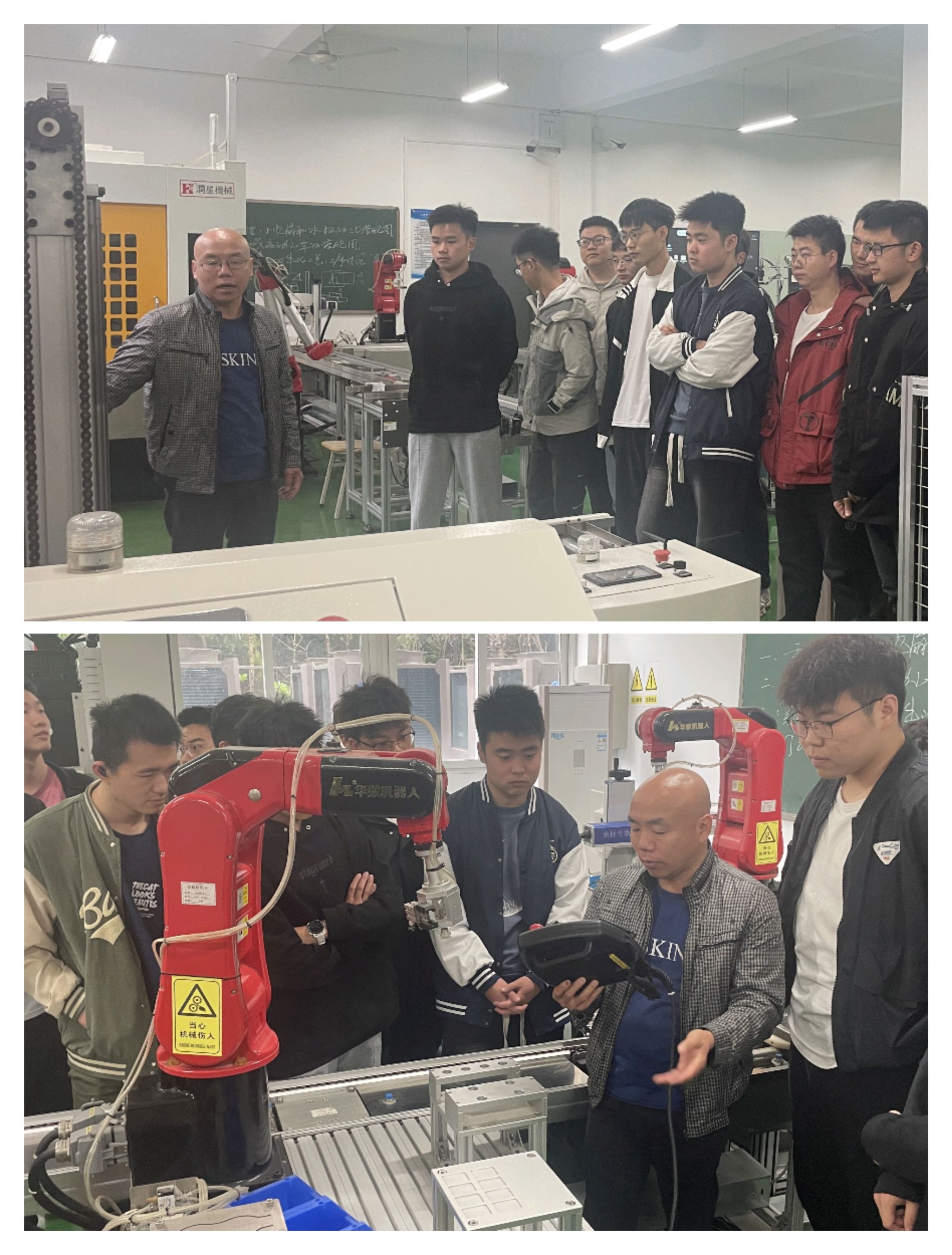 在《机械制造项目实践》课程中,刘祥荣工程师向同学们介绍了智能仓库、智能搬运等现代物流技术的最新应用,并结合工业机器人基本构造及示教编程、智能产线工作原理等实践教学内容,使同学们对现代工业工程的工艺设计有了更为直观的认识。