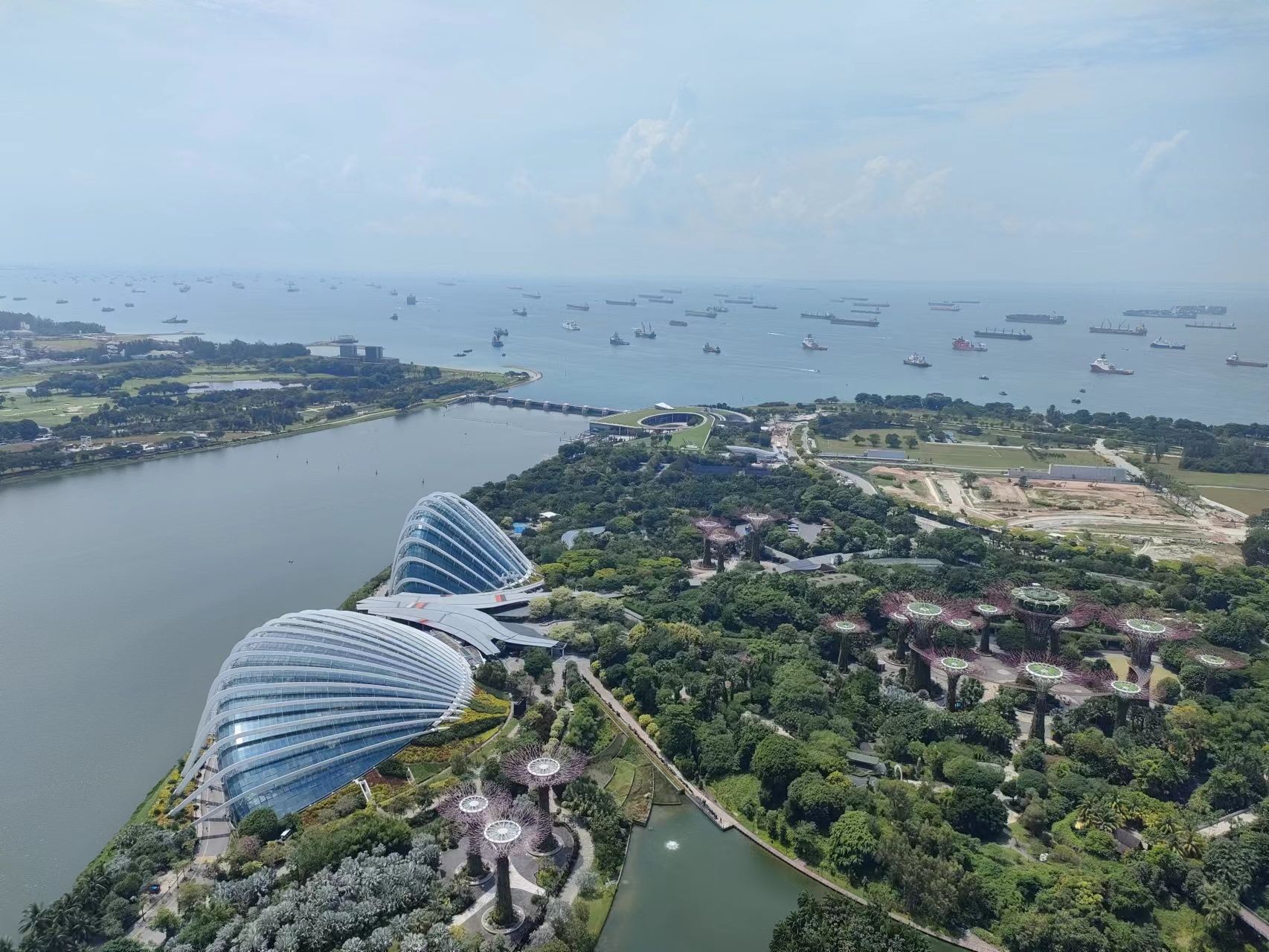 移通学子脚不停步地来到金沙酒店(Marina Bay Sands)。进入酒店大堂,就被眼前的空间所震撼,高耸的共享空间带来视觉上的盛宴。作为一个网红打卡胜地,大家对金沙酒店都略有耳闻,以船型的大楼顶所著名。来自各个国家的人们在这里齐聚一堂,欣赏新加坡独有的风景。在空中花园的左侧是马六甲海峡与小群岛;右侧可看见著城市群。移通学子们感叹着独具匠心的建筑,俯瞰着新加坡城市的宏伟景观。