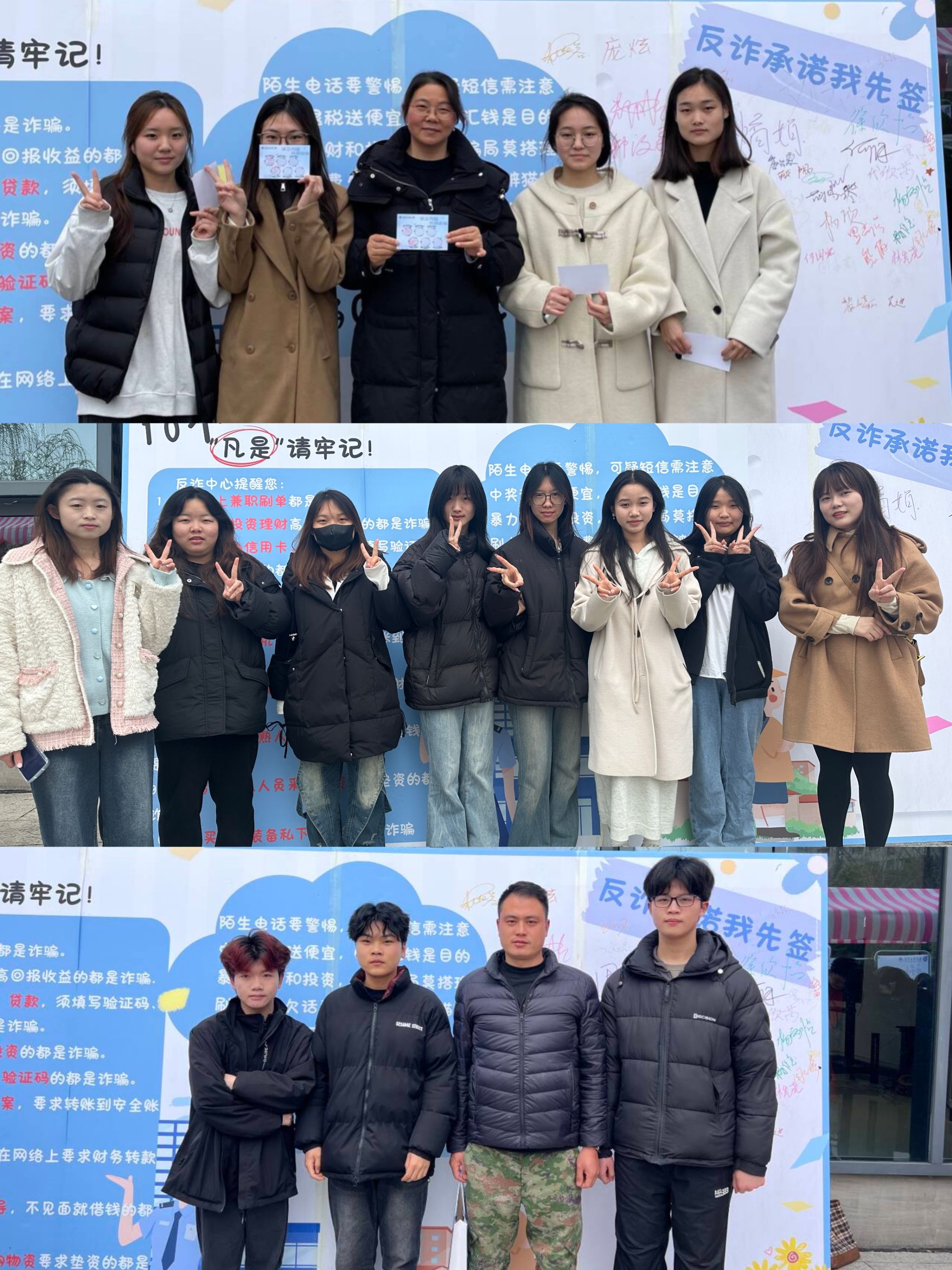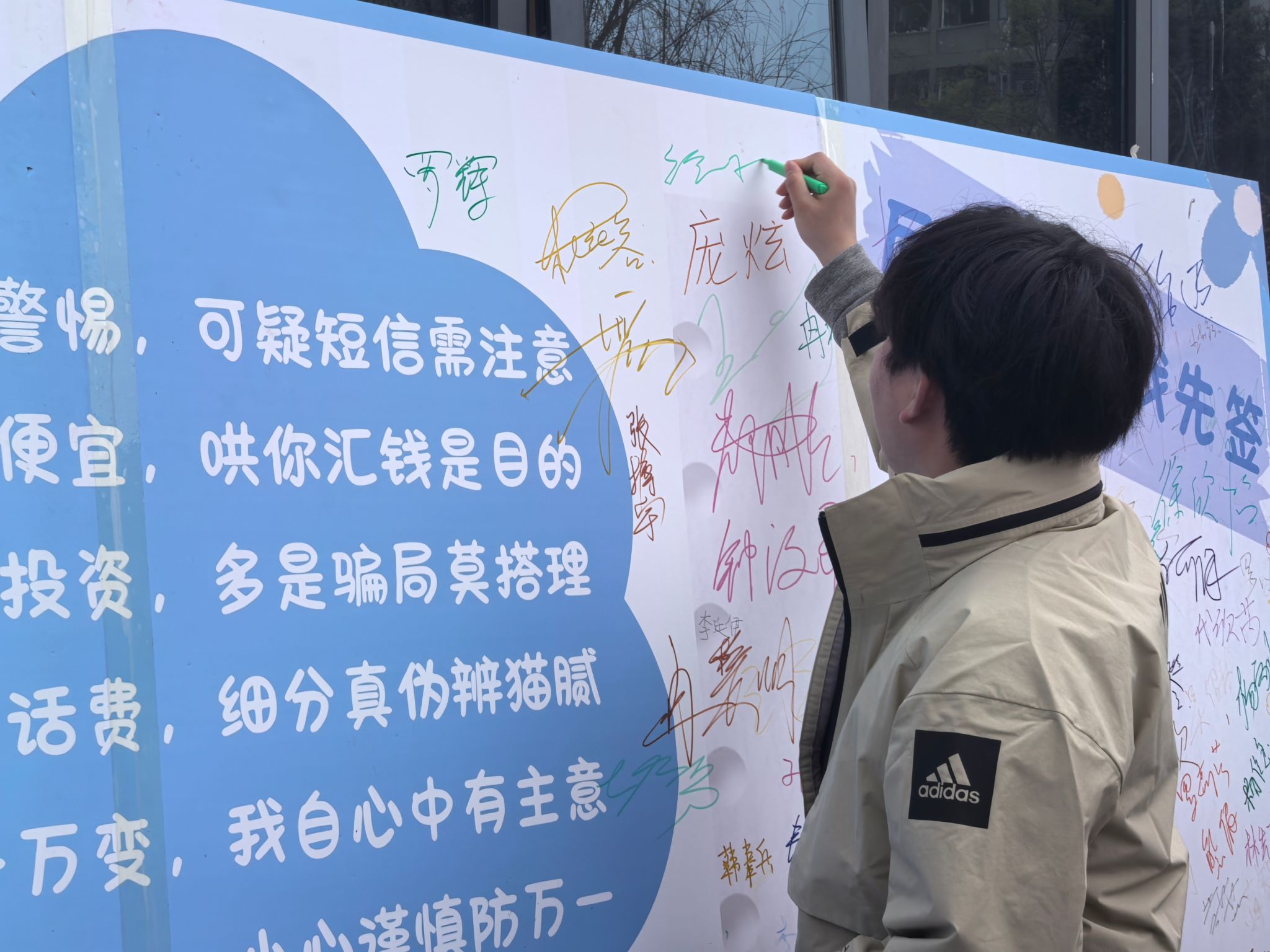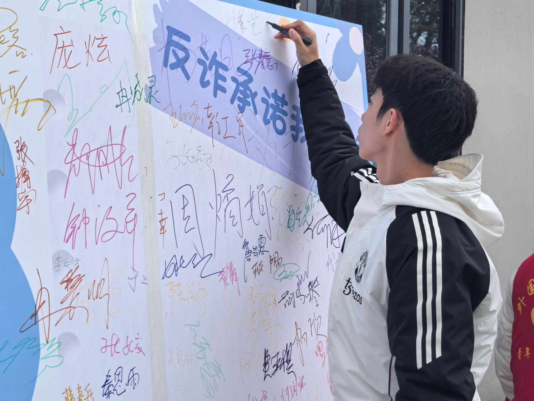 学生代表宣读《反诈承诺宣言》时,声音坚定而有力,每一个字都饱含着对反诈行动的决心。随后,“全民反诈签名墙”活动正式开启,异科导师们与同学们纷纷围上前去,拿起笔,在签名墙上郑重地签下自己的名字,并盖上象征着承诺的印章。这一刻,签名墙不再只是一面简单的墙,而是成为了全体参与者守护校园、抵御诈骗的决心见证。